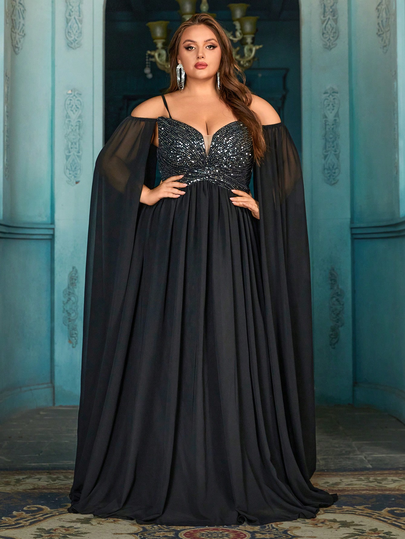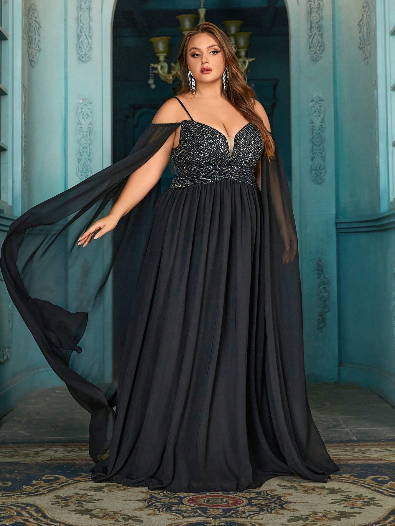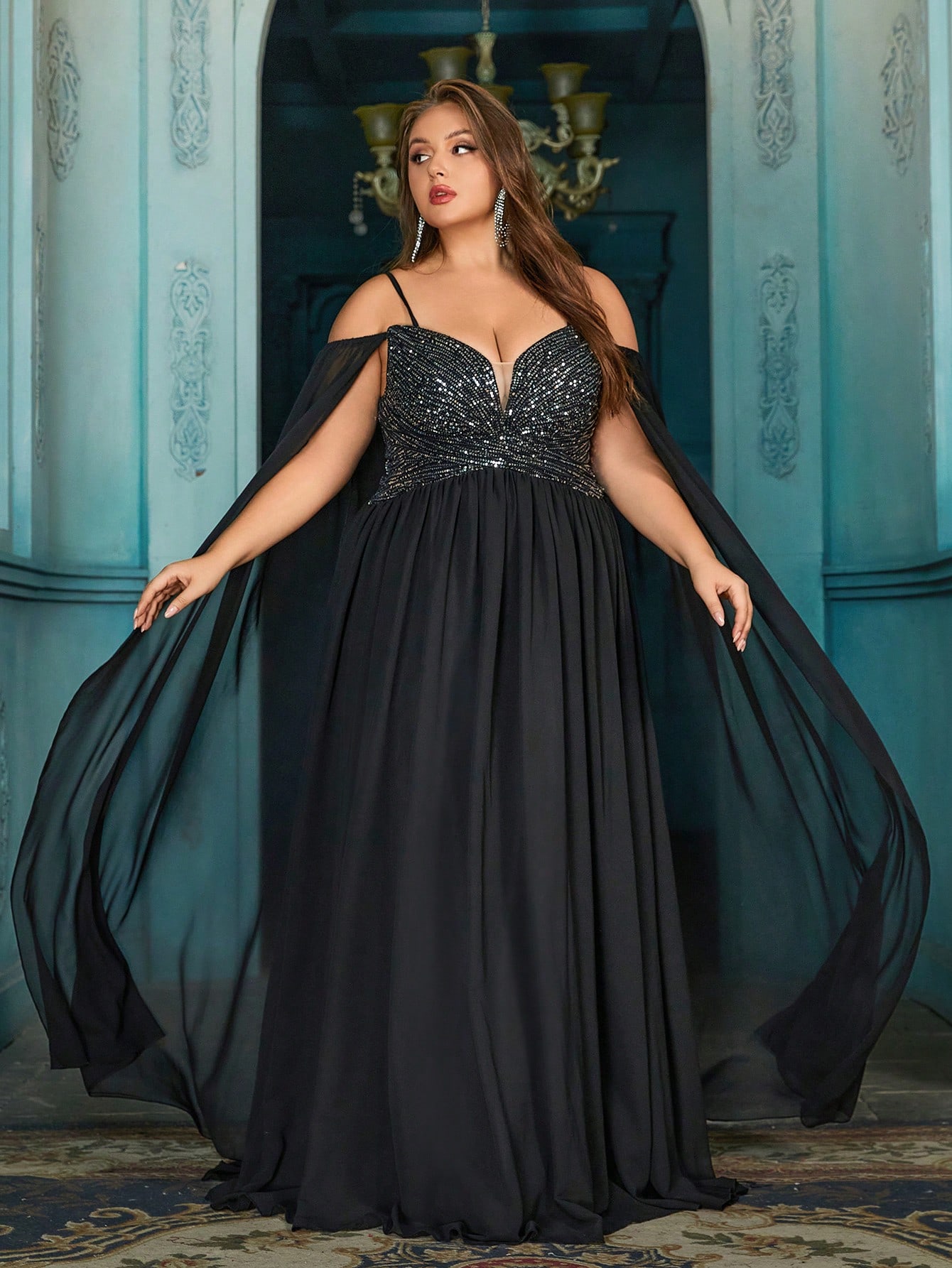 Goddess Elegant Black Plus Size Sequin Splicing Strapless Cape Sleeve Halter Gown Dresses