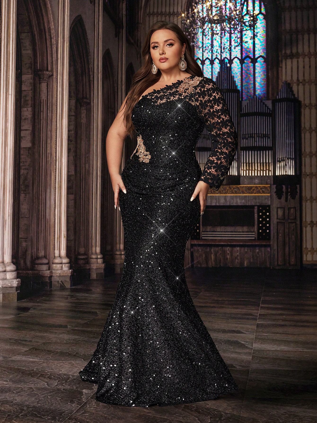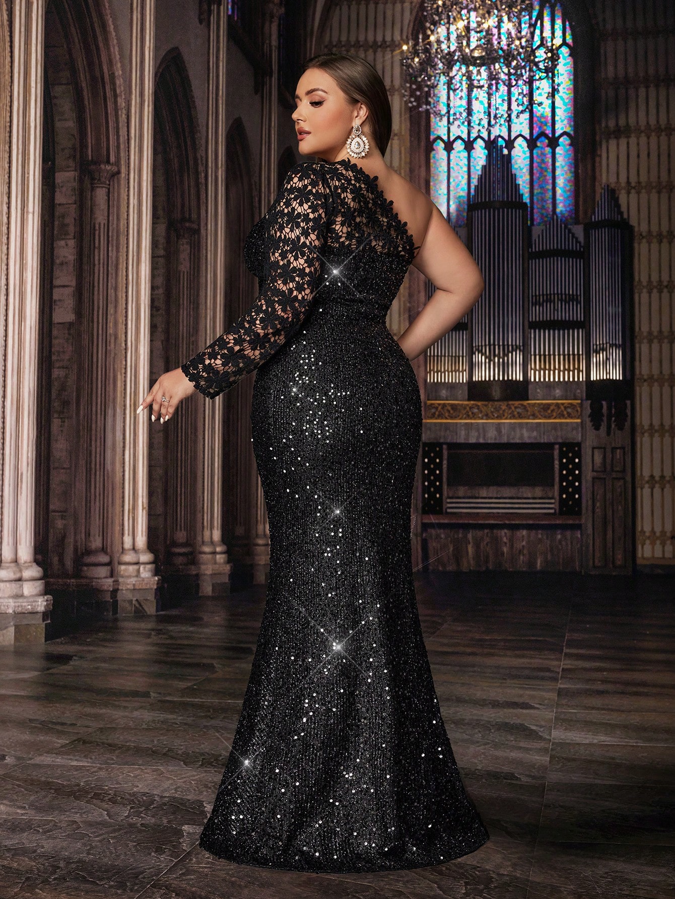 Graceful Plus Size Women Black Sequin Asymmetrical Neck One Shoulder Slit Gown Dresses