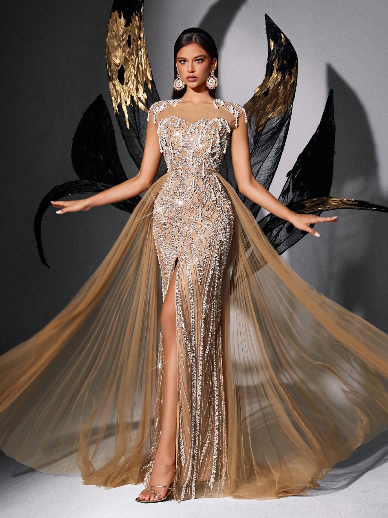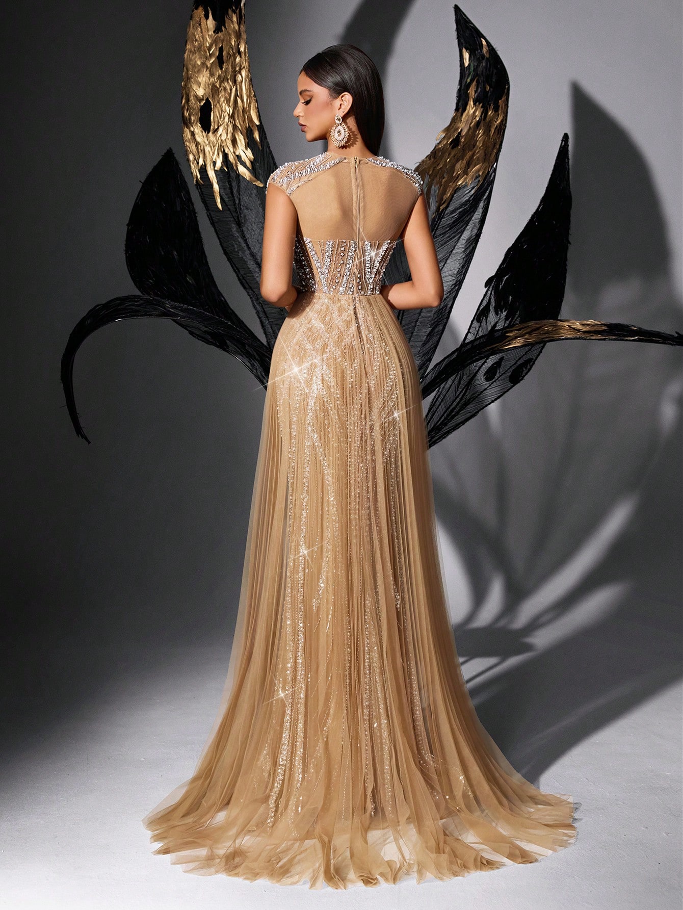 New Elegant Beaded Party Formal Dress Bling Sequins Upscale Evening Gown For Red Carpet, Galas, Charity Prom, Birthday Party, Fiesta, Anniversary Celebration Solid Color Cap Sleeve High Slit Maxi Long Dresses