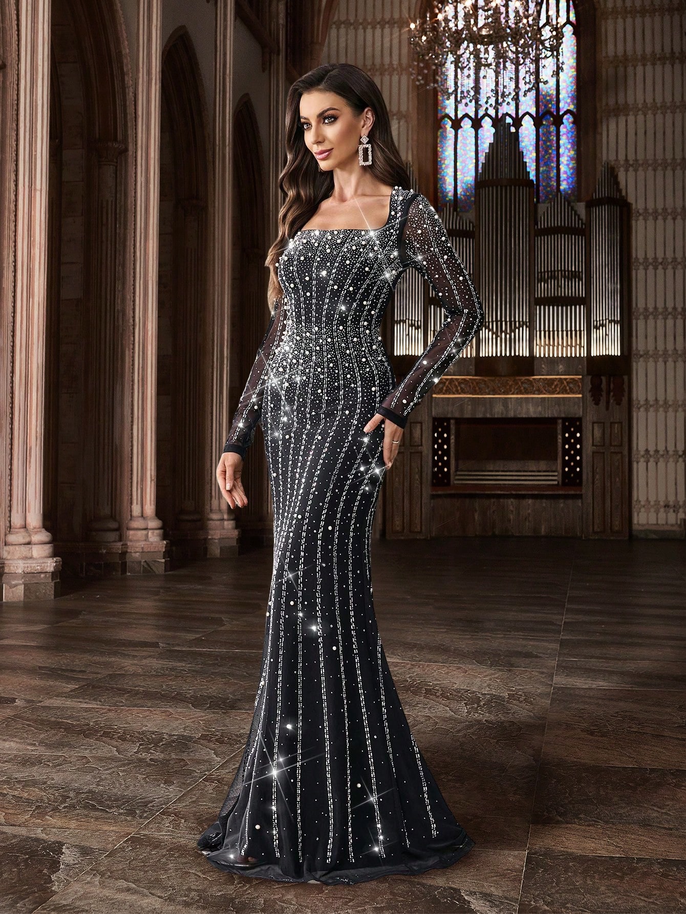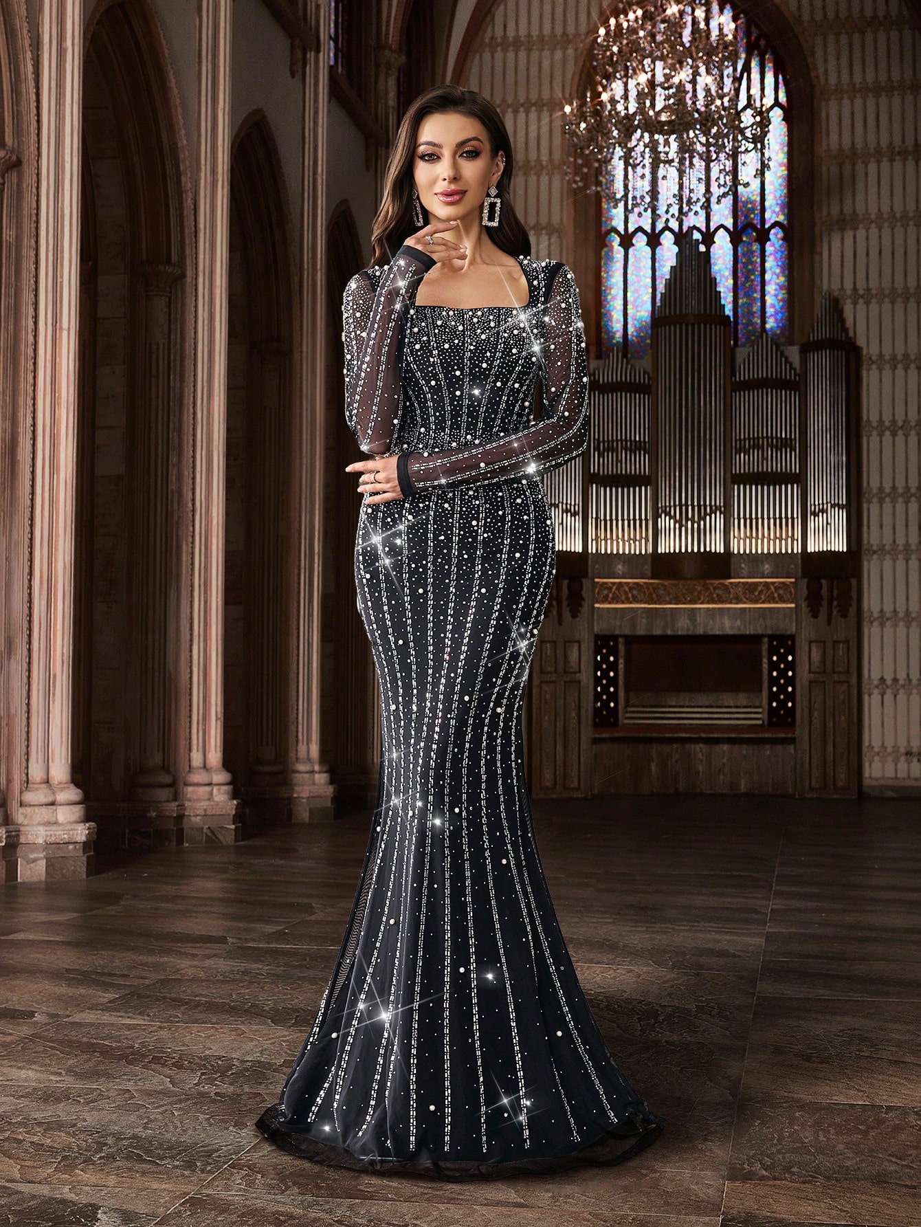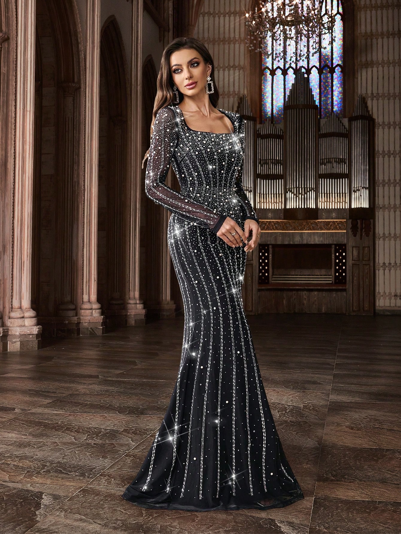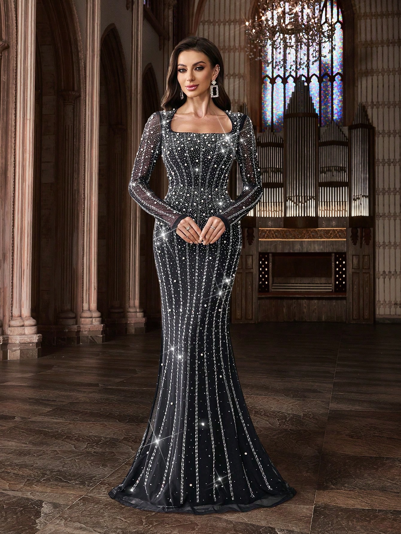 Noble Temperament Women Beaded Hot Drill Party Evening Gown Luxury Bling Rhinestone Formal Dress For Red Carpet, Galas, Dinner Party, Charity Prom, Concert, Cocktail Party Black Long Sleeve Square Neck Gowns