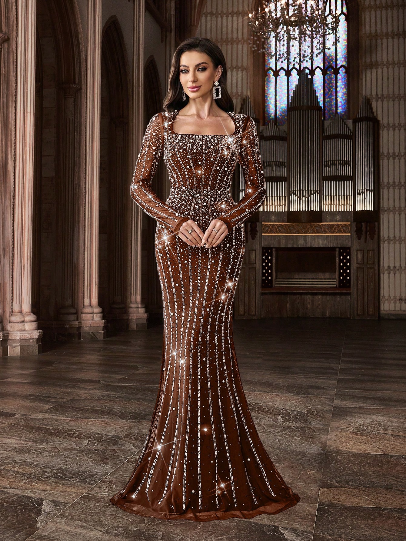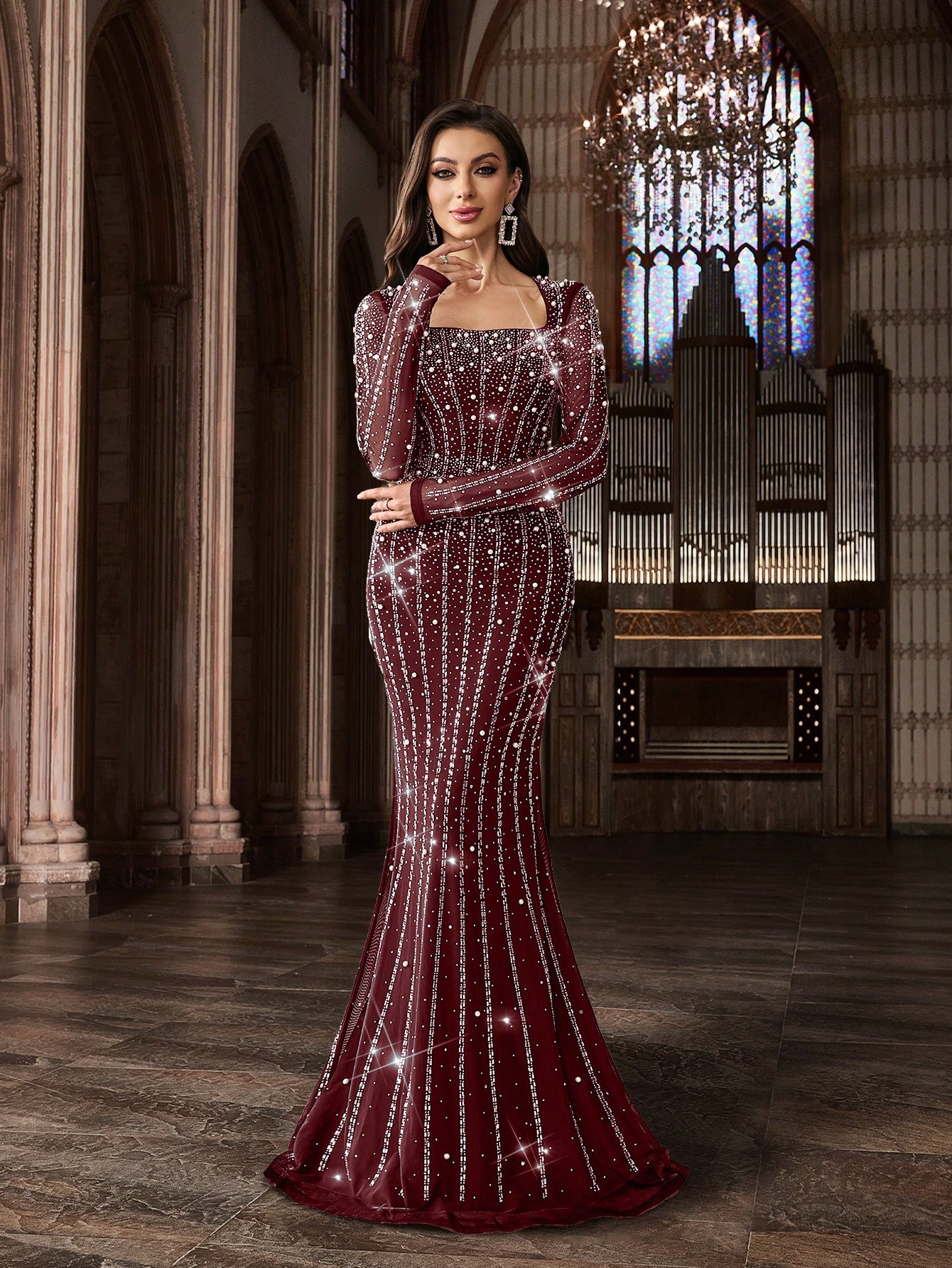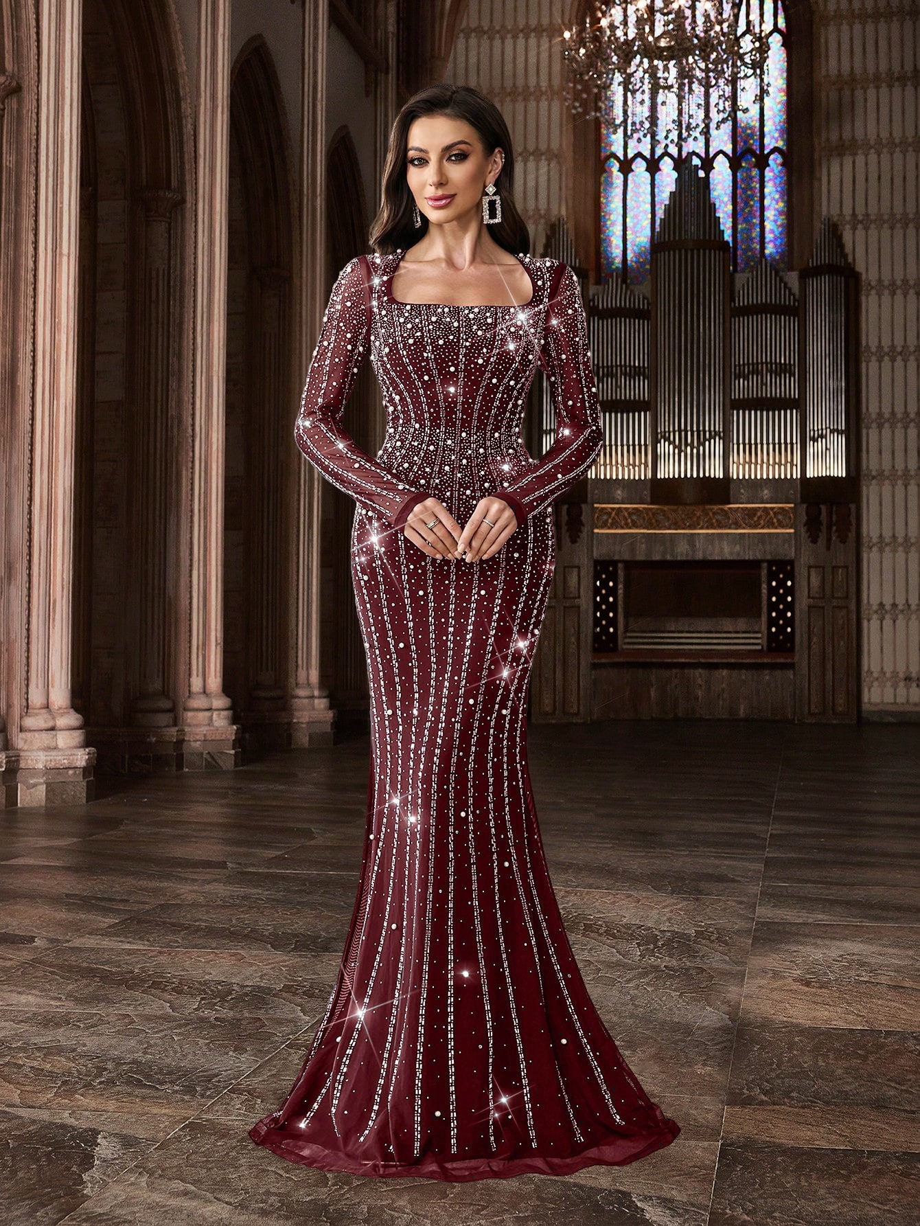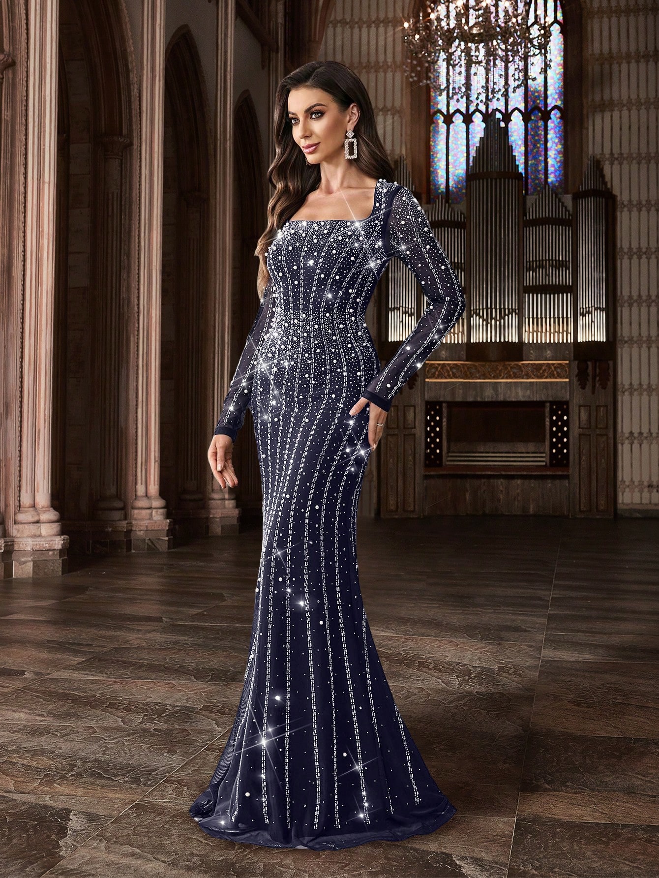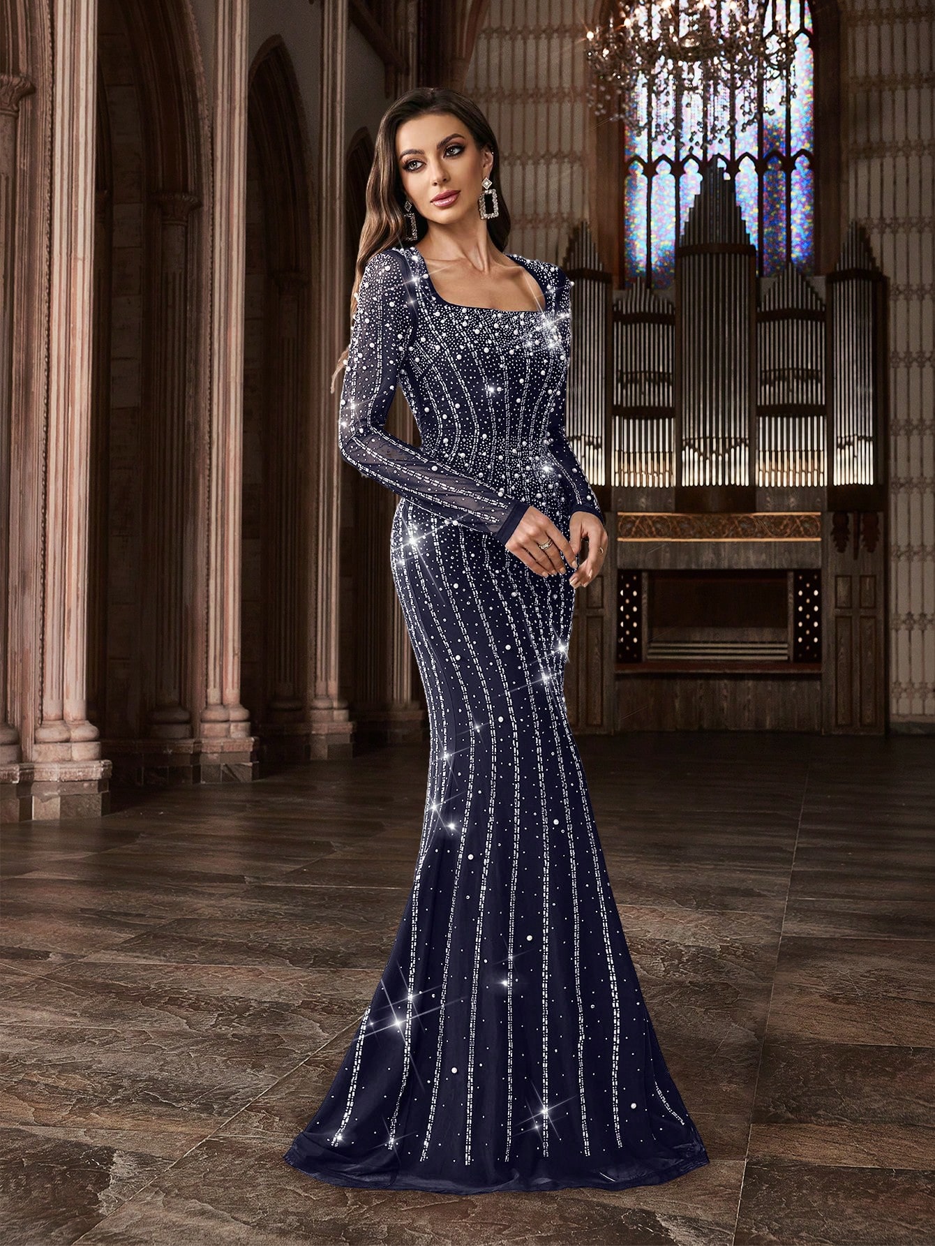 Noble Temperament Women Beaded Hot Drill Party Evening Gown Luxury Bling Rhinestone Formal Dress For Red Carpet, Galas, Dinner Party, Charity Prom, Concert, Cocktail Party Black Long Sleeve Square Neck Gowns