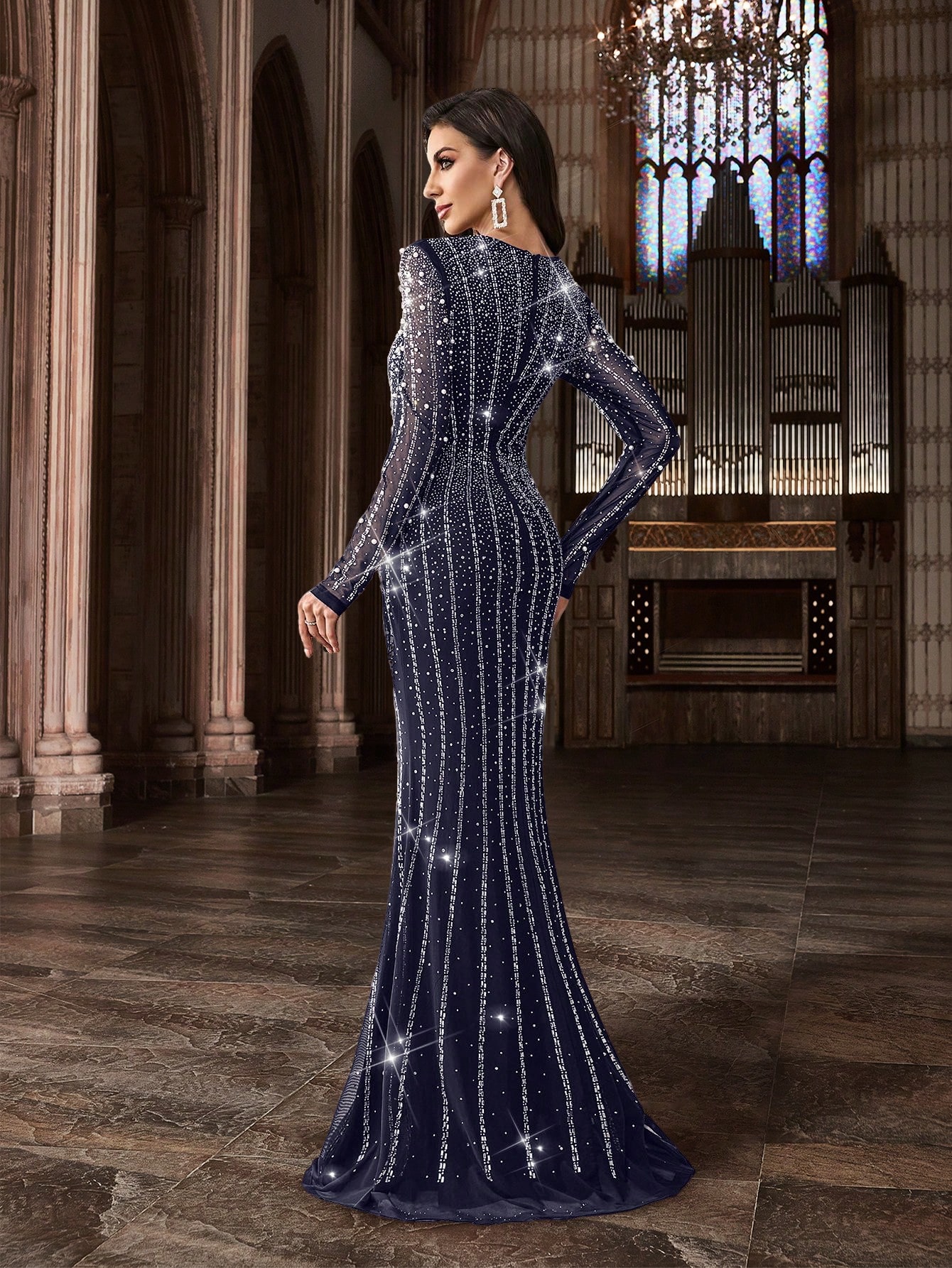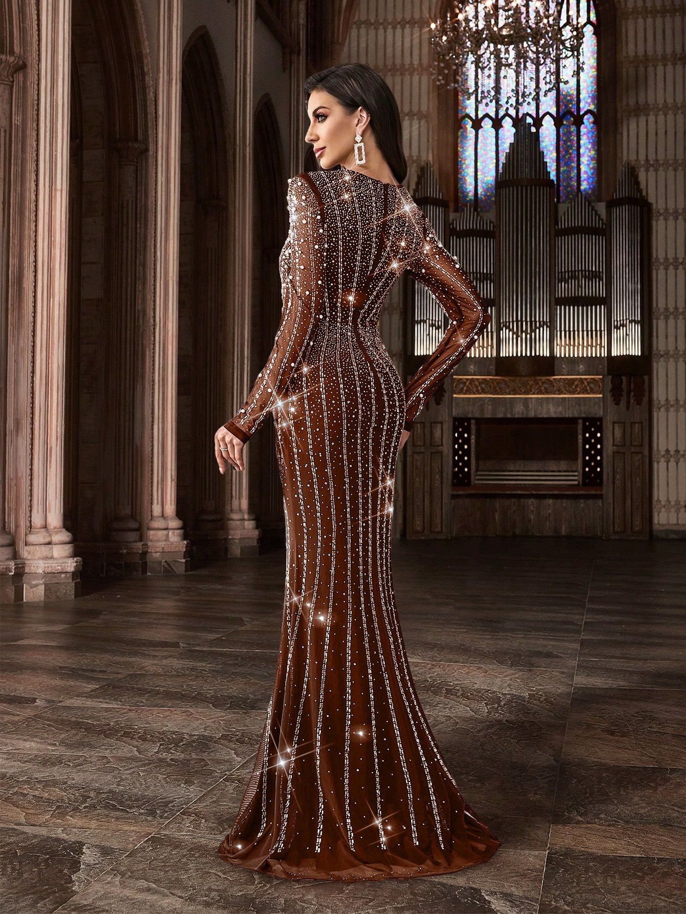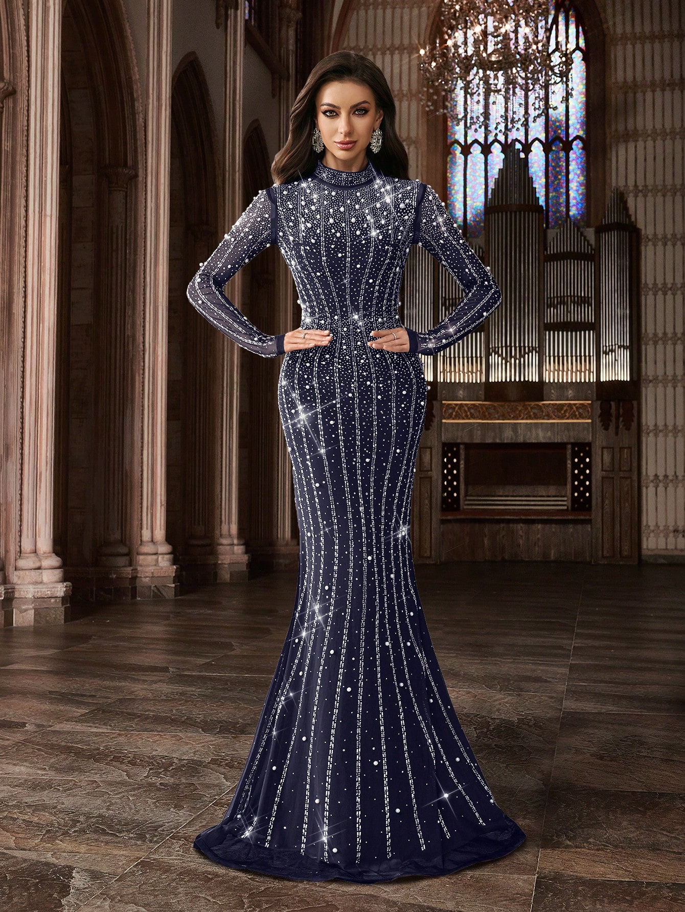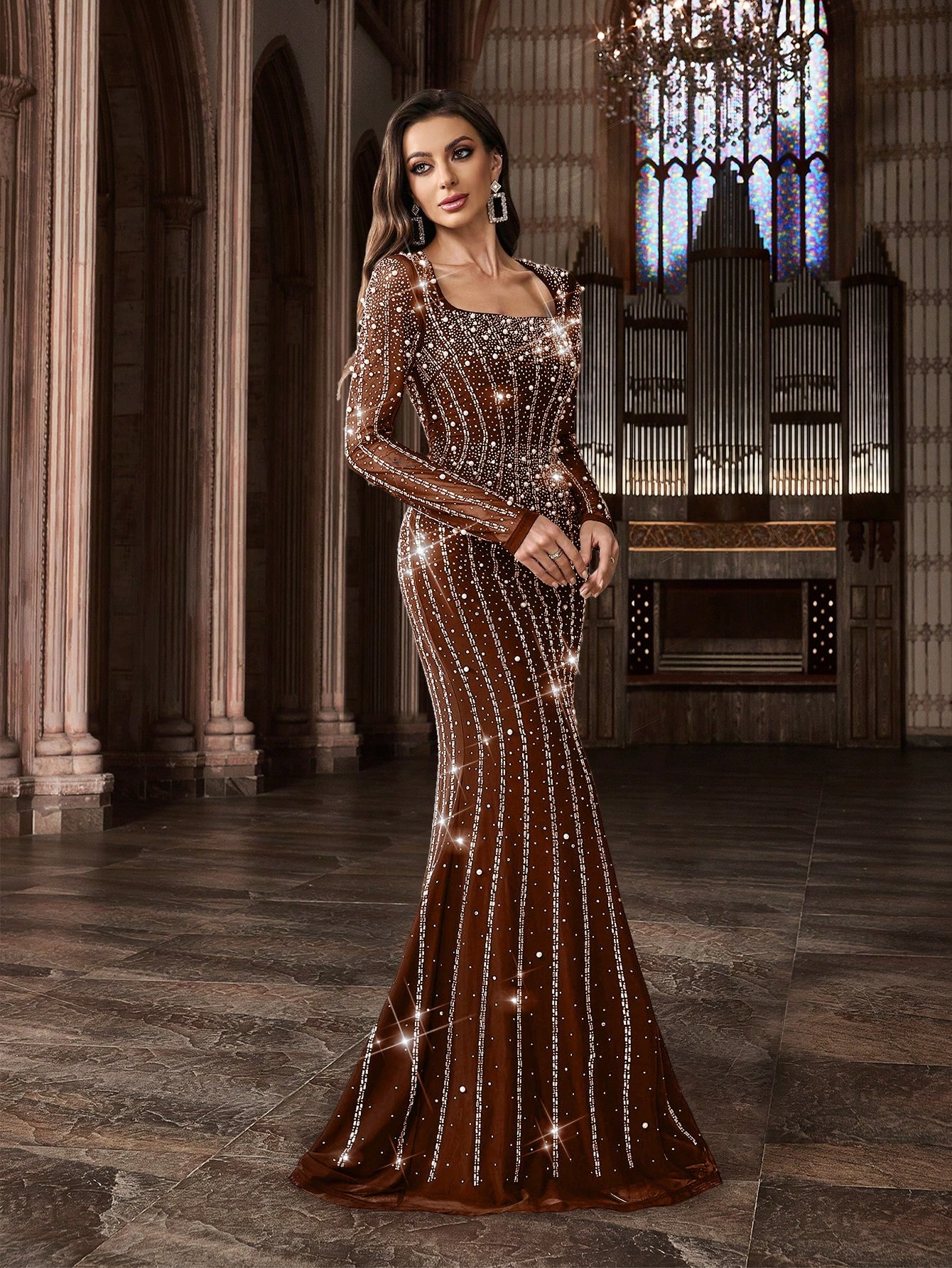 Noble Temperament Women Beaded Hot Drill Party Evening Gown Luxury Bling Rhinestone Formal Dress For Red Carpet, Galas, Dinner Party, Charity Prom, Concert, Cocktail Party Black Long Sleeve Square Neck Gowns