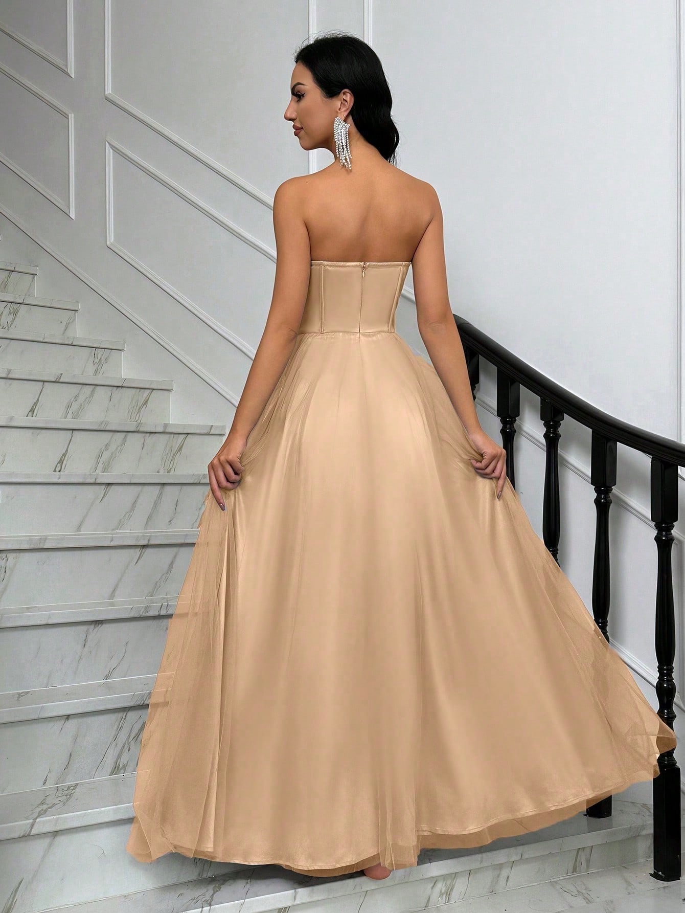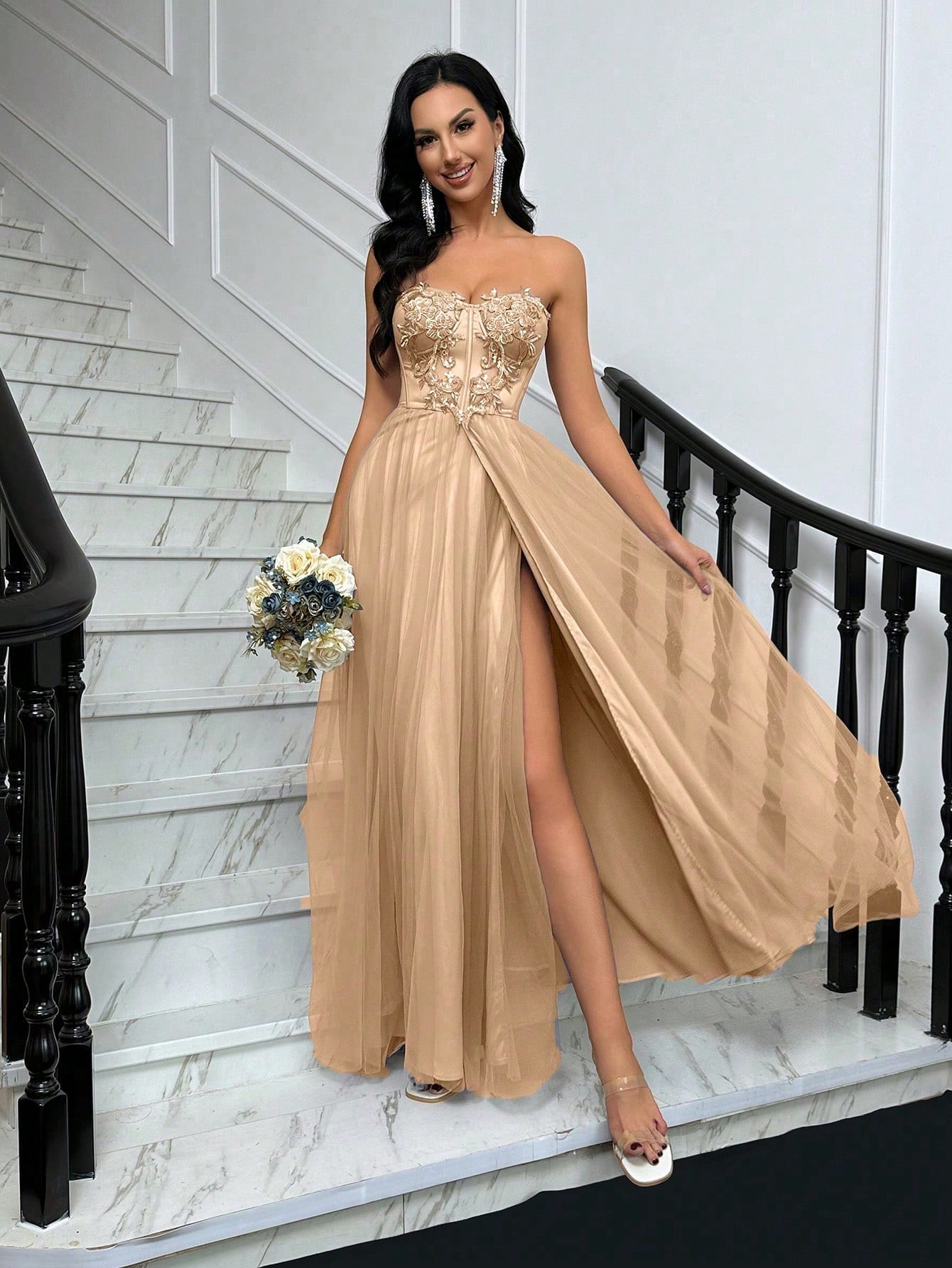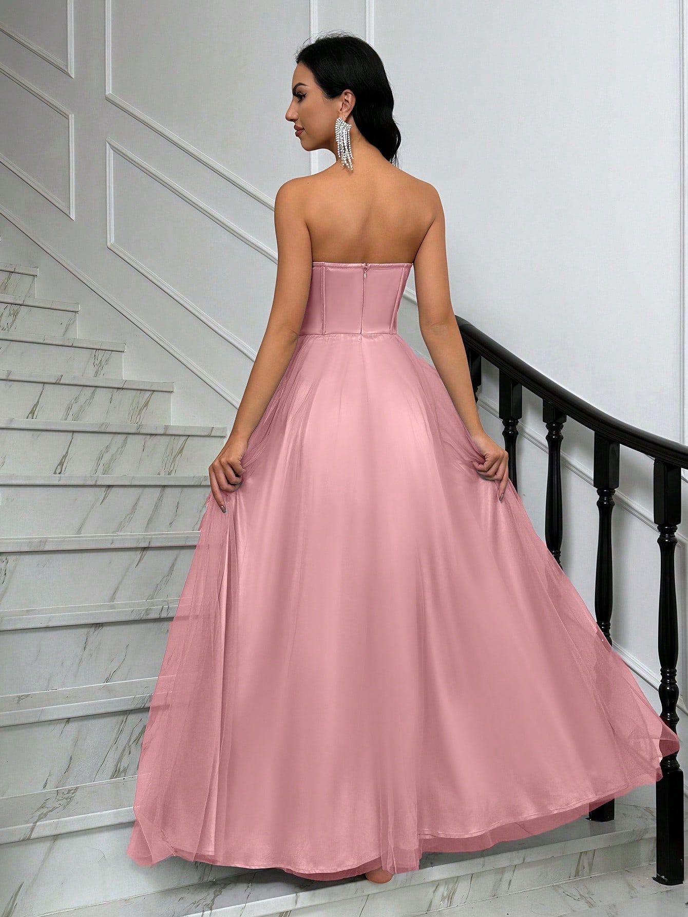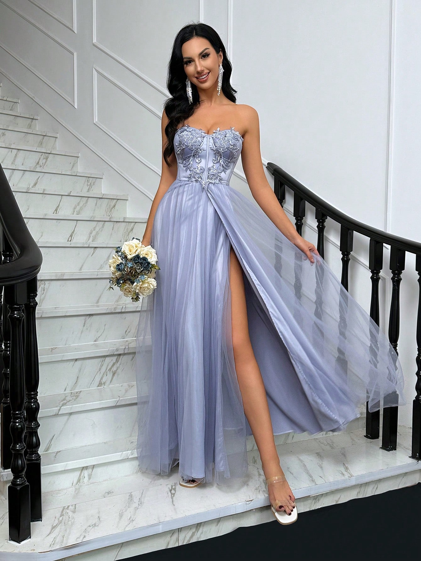 Princess Style Fairy Women Senior Evening Gown Romantic Summer Formal Dress For Graduation Season Prom, Birthday Party, Galas, Wedding Guest, Cocktail, Fiesta Solid Color Strapless Backless Slit Dresses