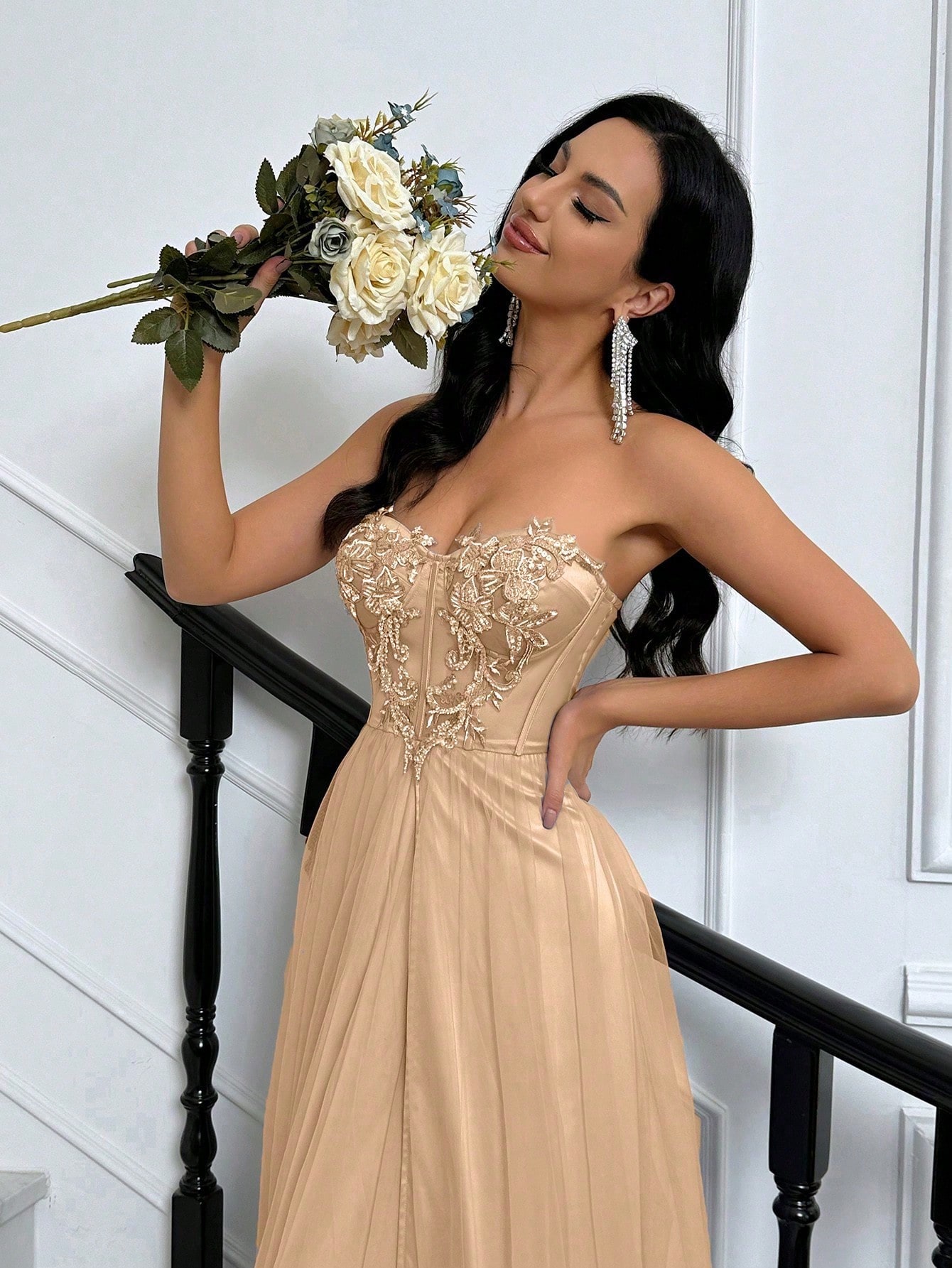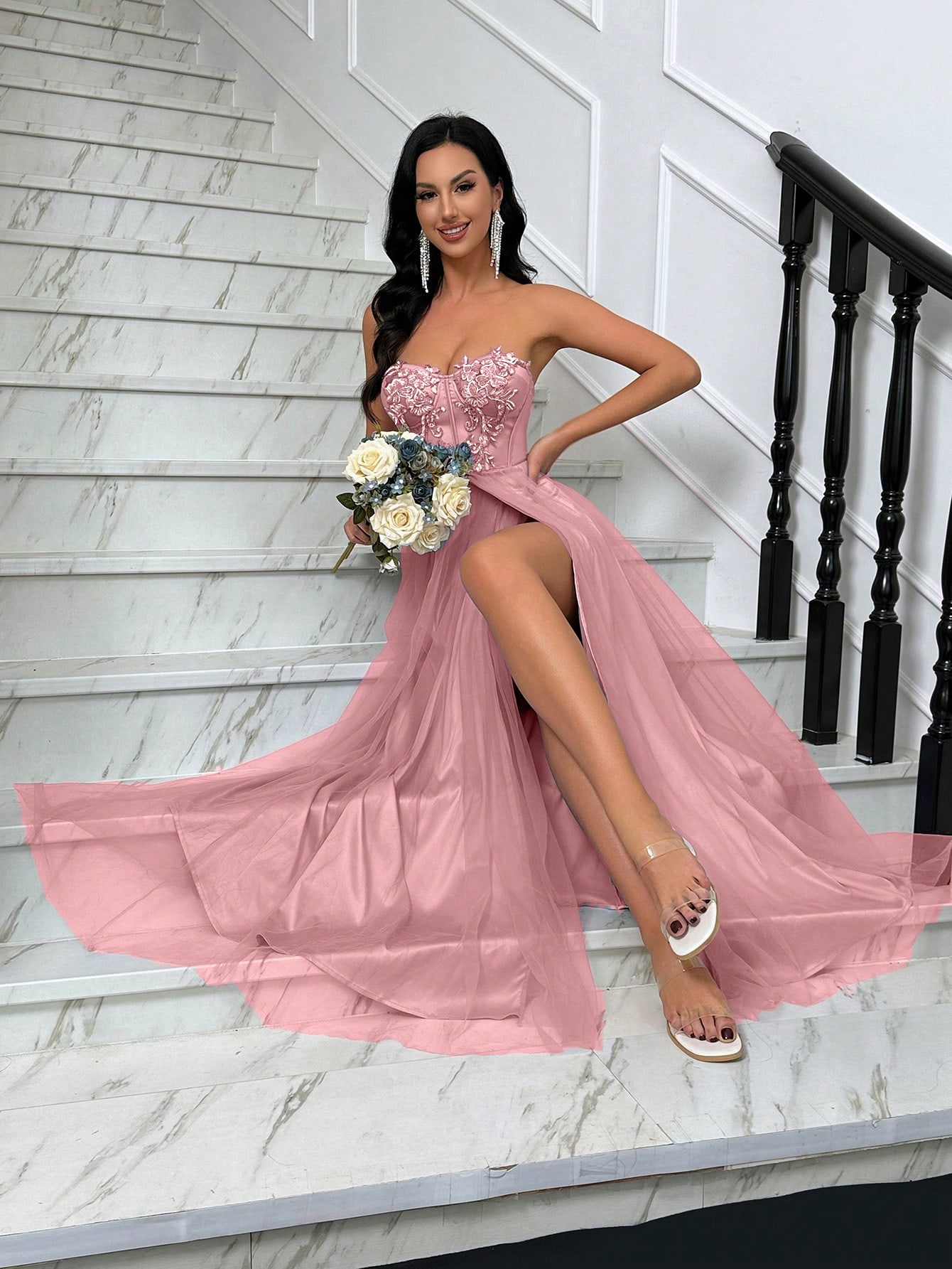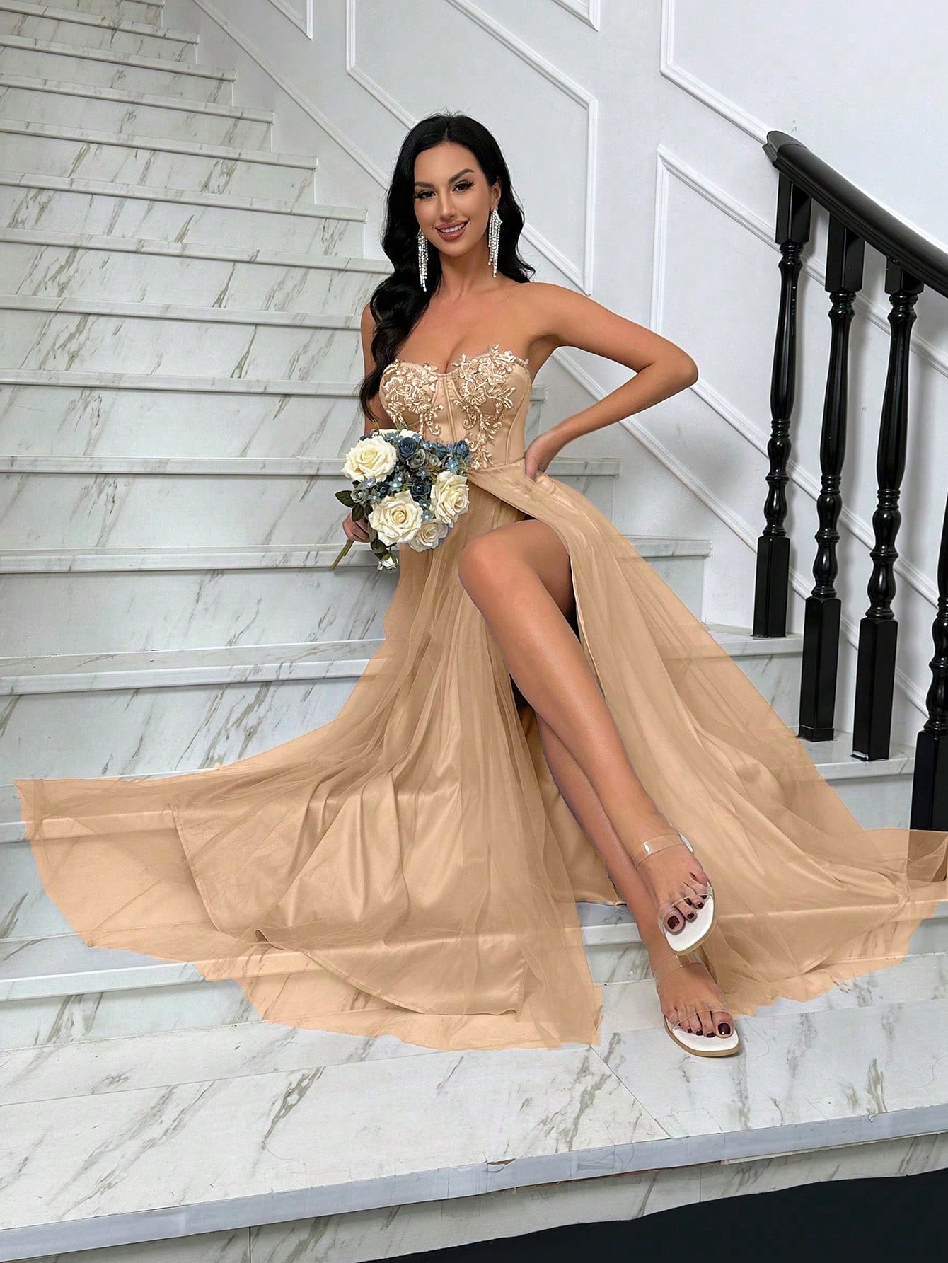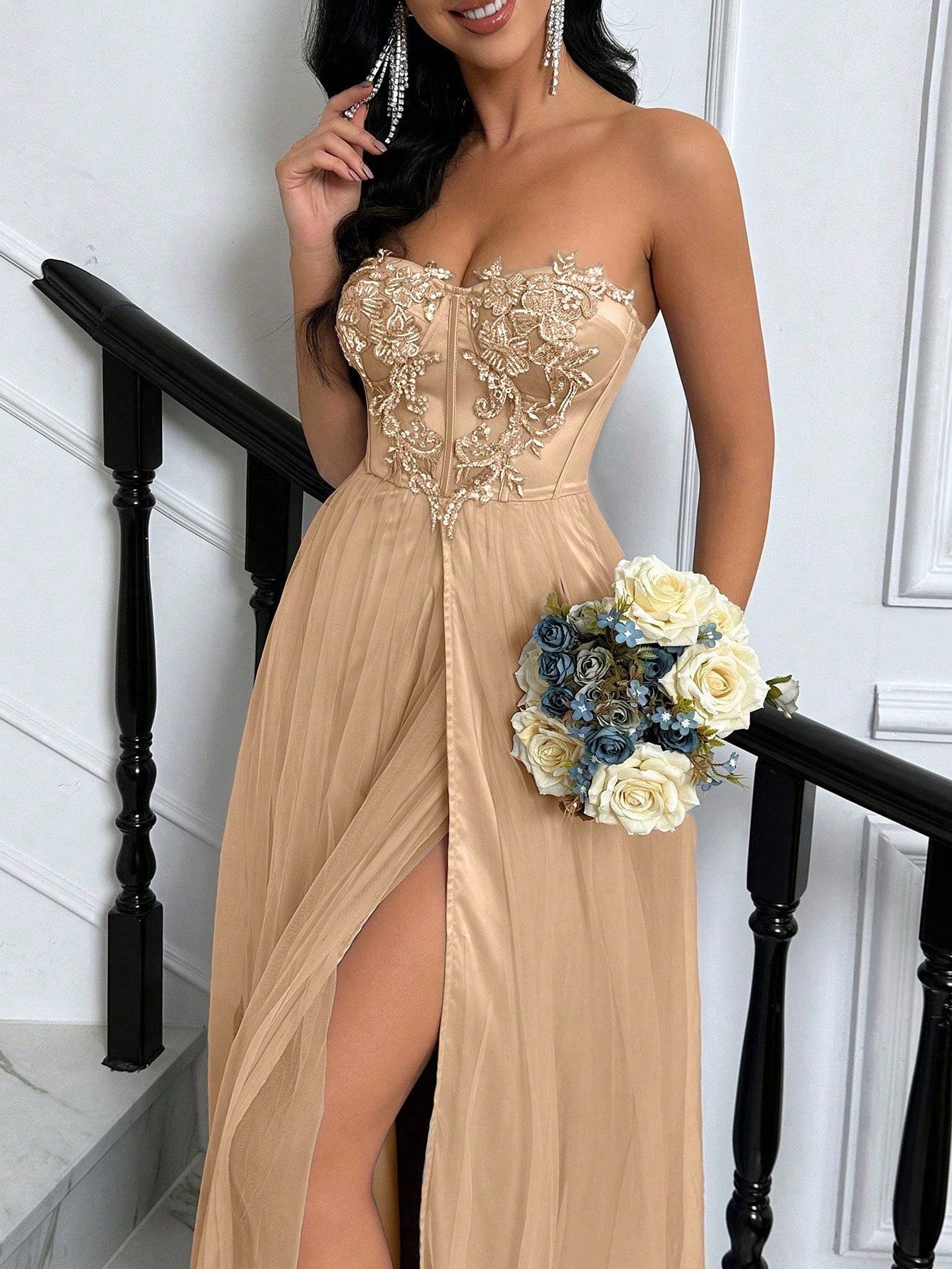 Princess Style Fairy Women Senior Evening Gown Romantic Summer Formal Dress For Graduation Season Prom, Birthday Party, Galas, Wedding Guest, Cocktail, Fiesta Solid Color Strapless Backless Slit Dresses