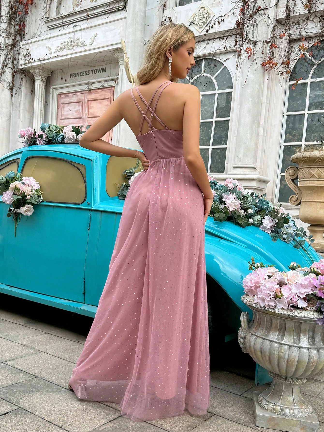 Romantic Glamorous Solid Color Sequin Backless Slit Halter Bridesmaid Gown Dresses