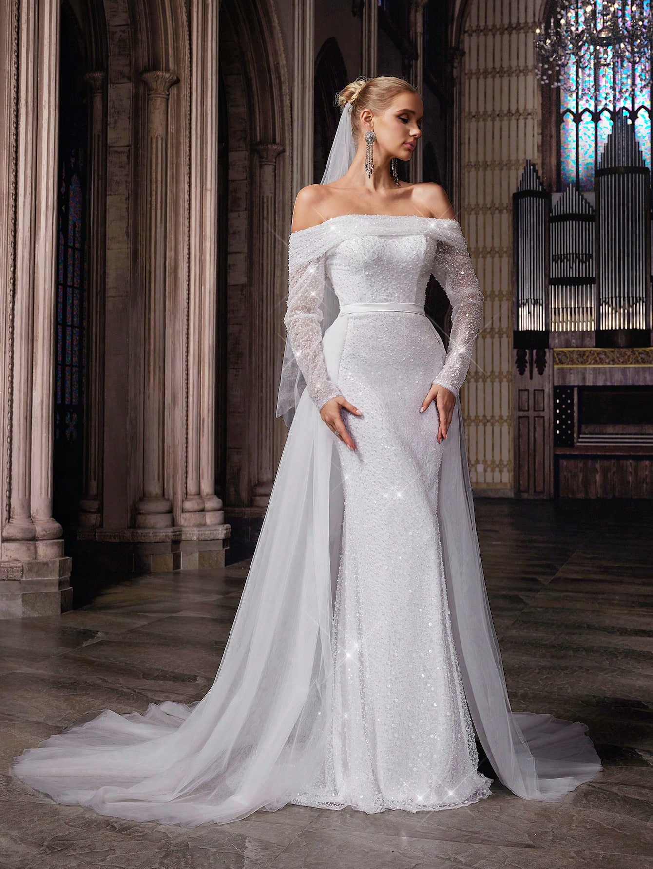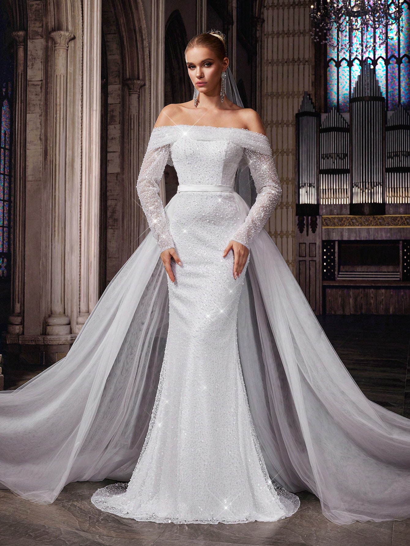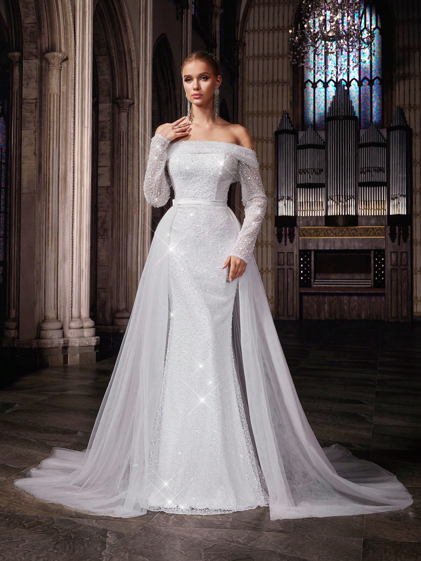 Shiny Pure White Women Wedding Gown Perfect Bride Formal Dress For Weddings, Dinner, Wedding Photos, Fashion Party One Shoulder Long Sleeve Mesh Bridal Gowns