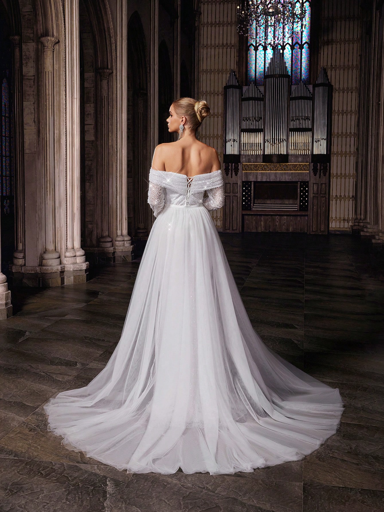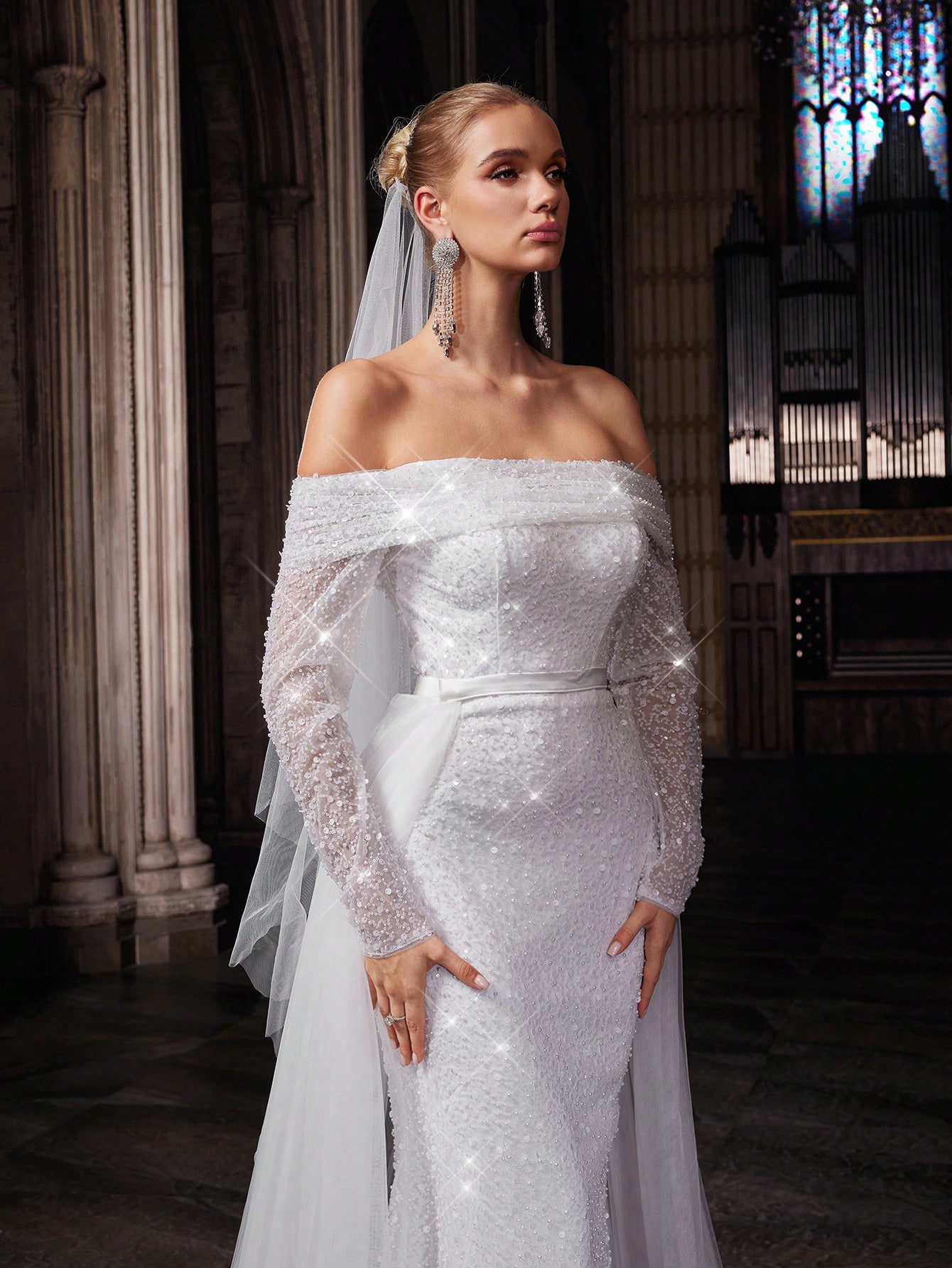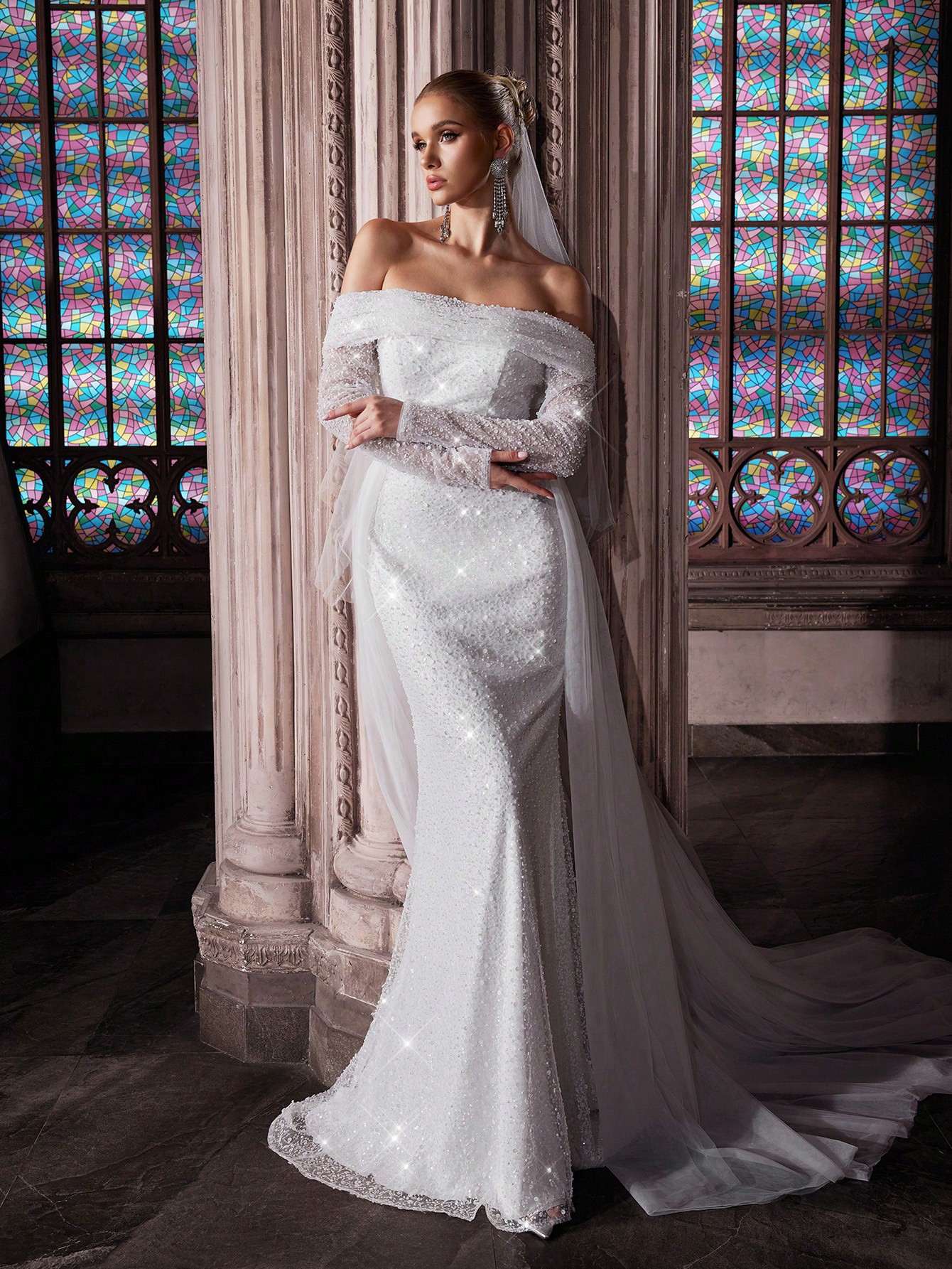 Shiny Pure White Women Wedding Gown Perfect Bride Formal Dress For Weddings, Dinner, Wedding Photos, Fashion Party One Shoulder Long Sleeve Mesh Bridal Gowns