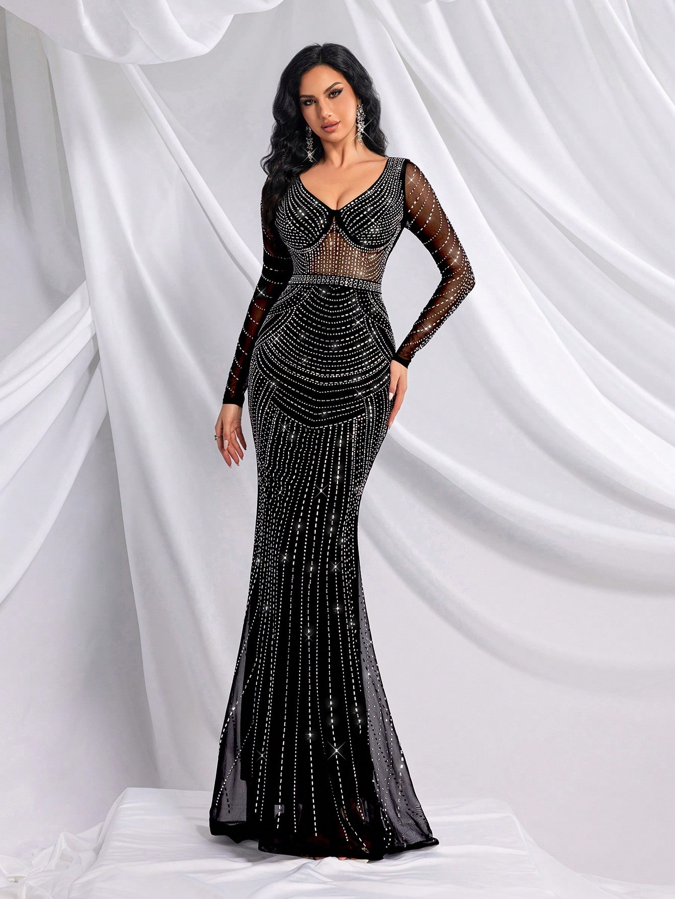 Sparkling Mesh Splicing Hot Drill Rhinestone V-Neck Long Sleeve Slim Gown Dresses