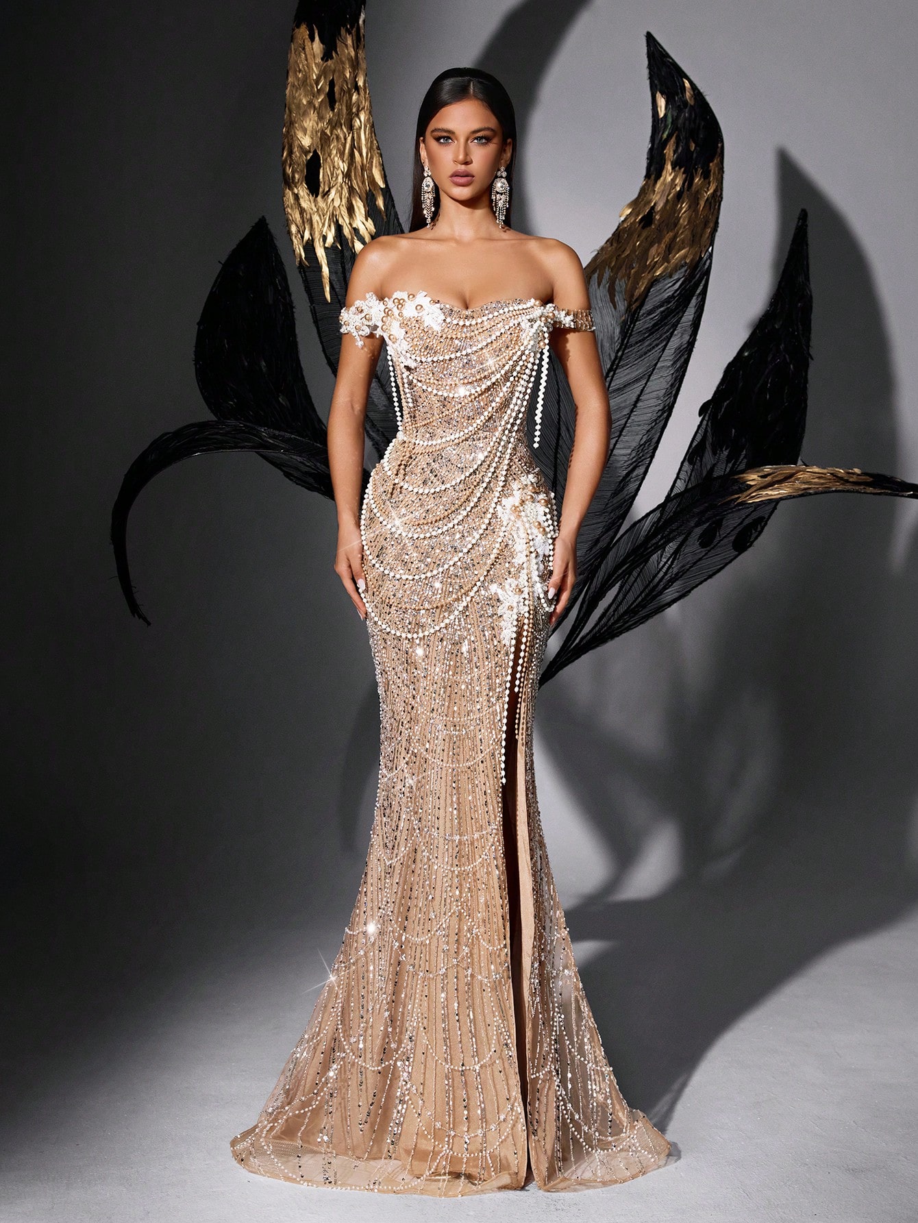 Sparkling Solid Color Beaded Sequin High Slit Strapless Gown Dresses