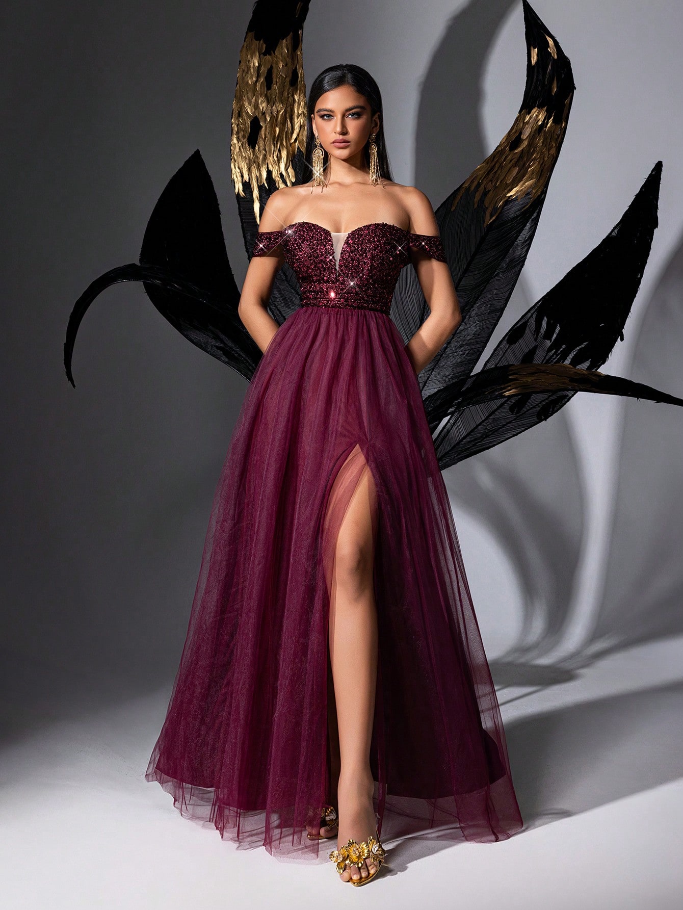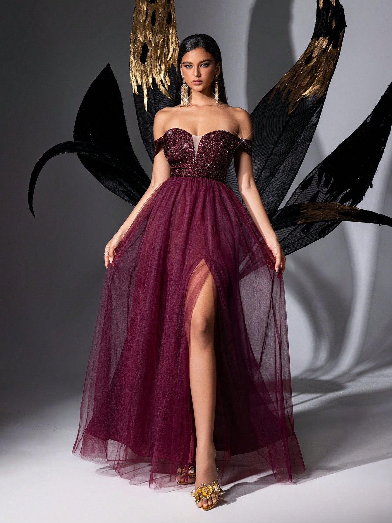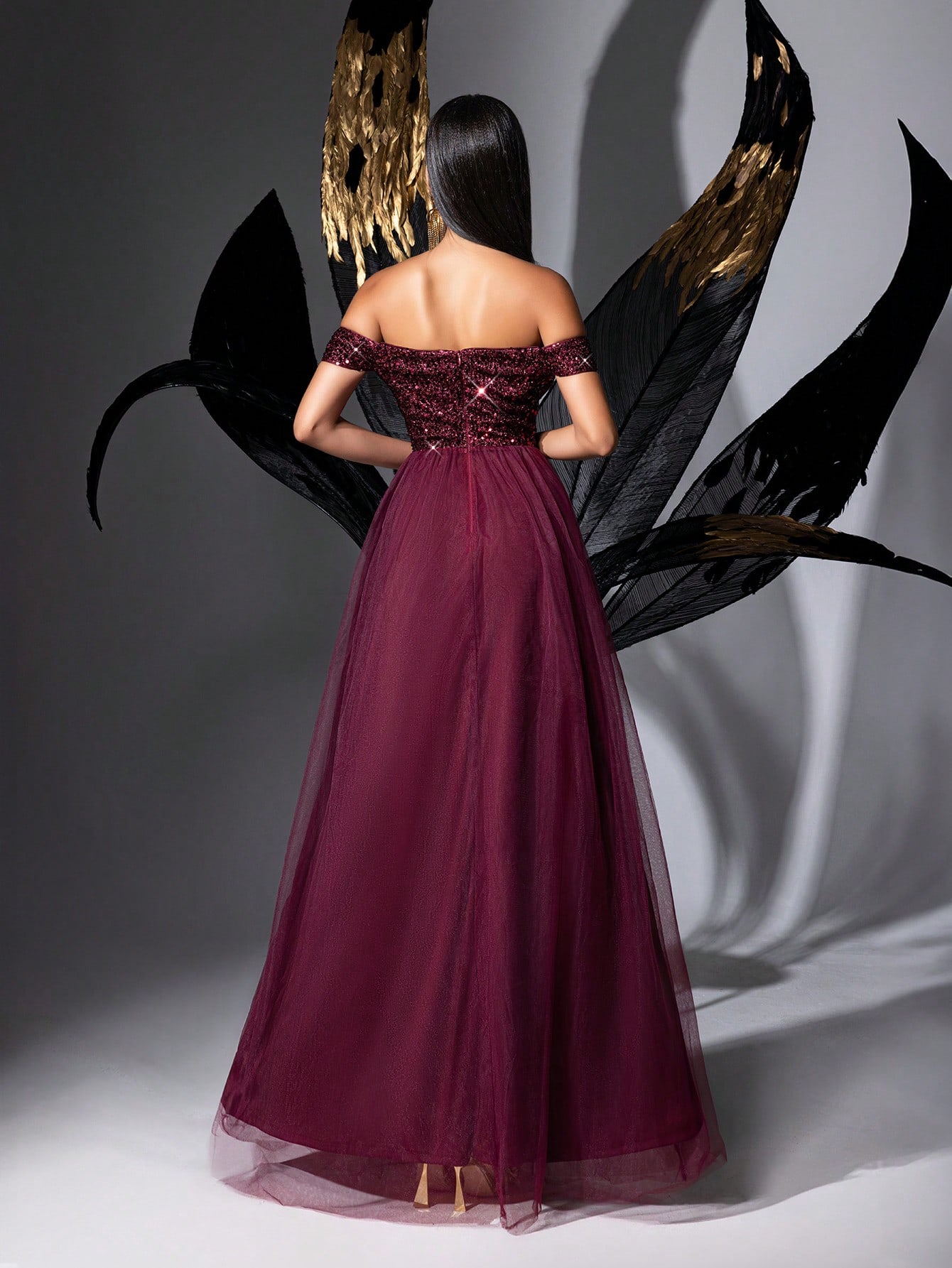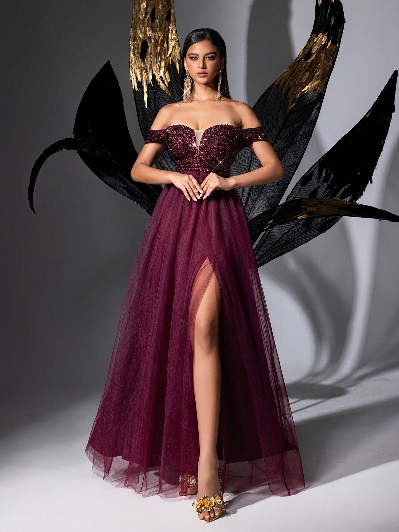 Stunning Gorgeous Burgundy One Shoulder Sequined Mesh Long Women Gown Dresses For Evening Party, Wedding Guests