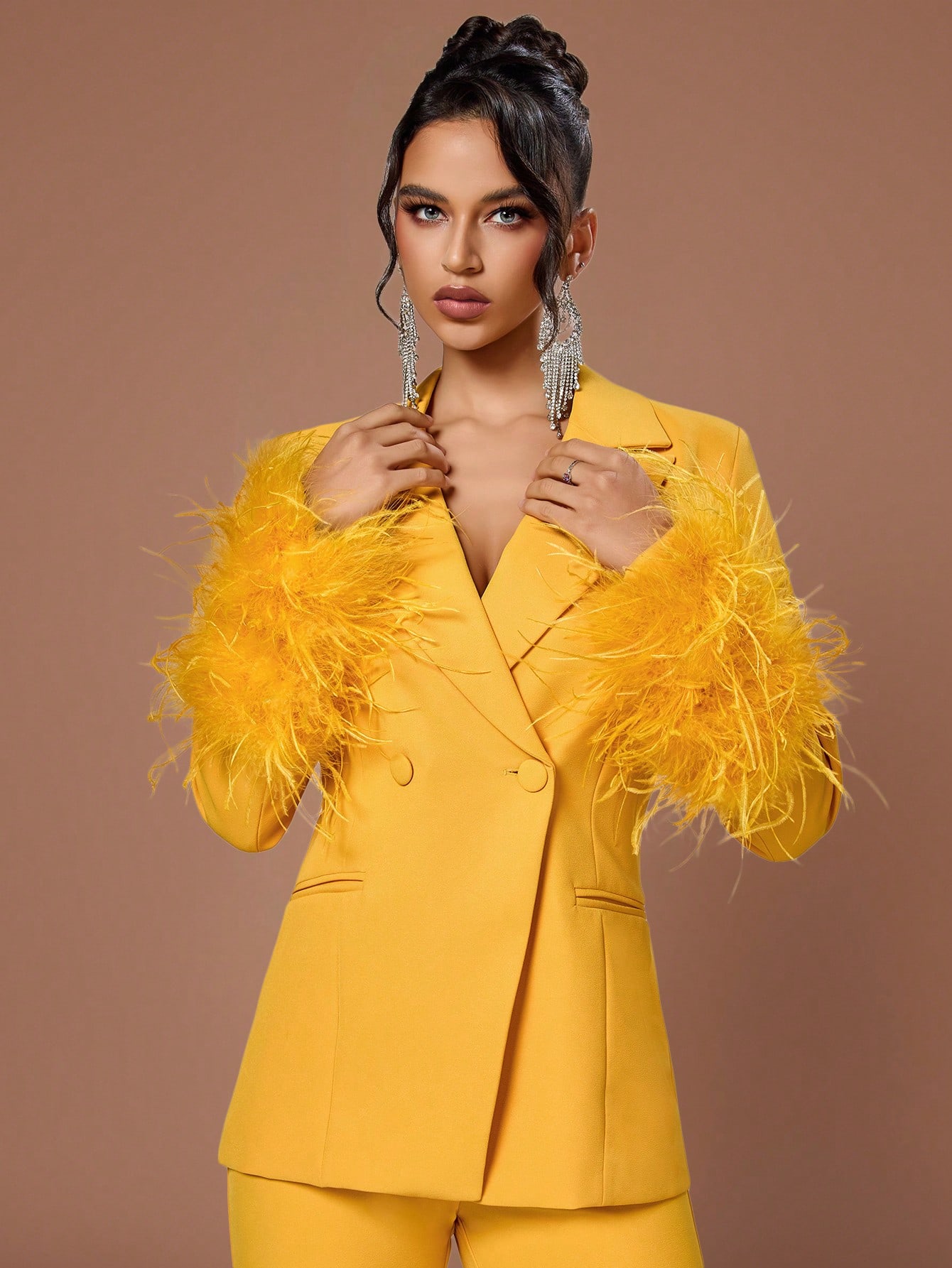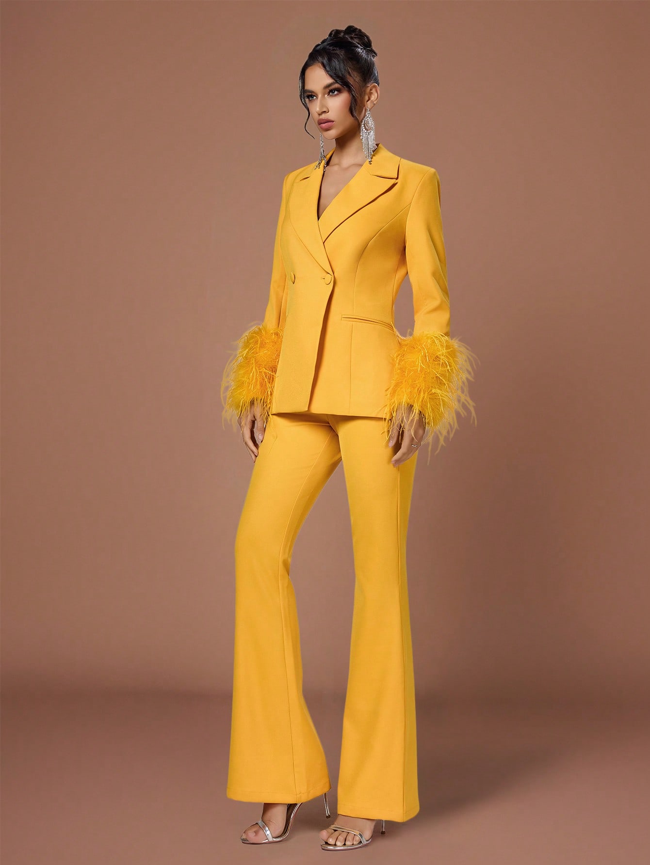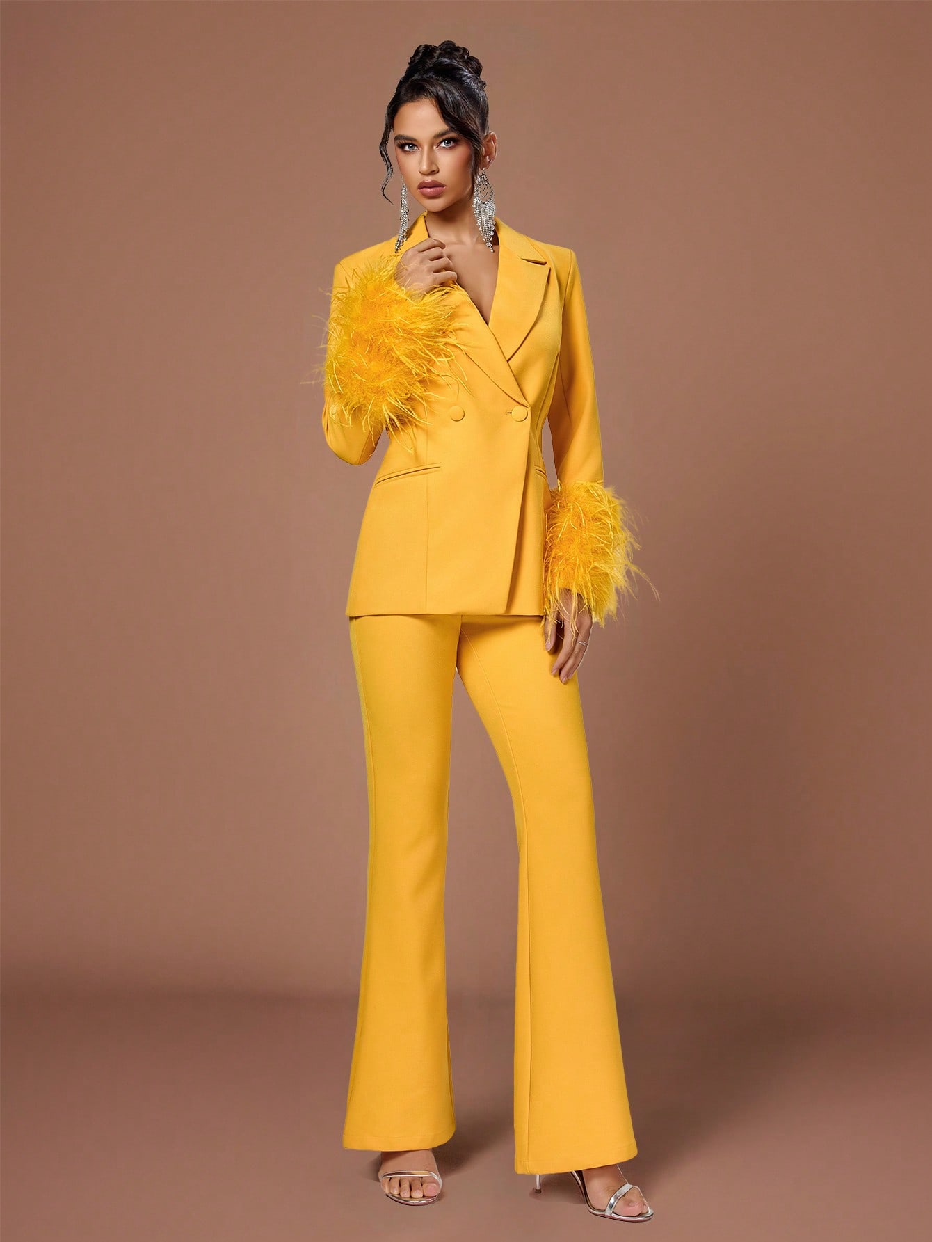 Women's Chic Yellow Double-Breasted Suit Set with Feather Cuffs Collar Regular Sleeve Non-Stretch Fabric for Elegant Occasions