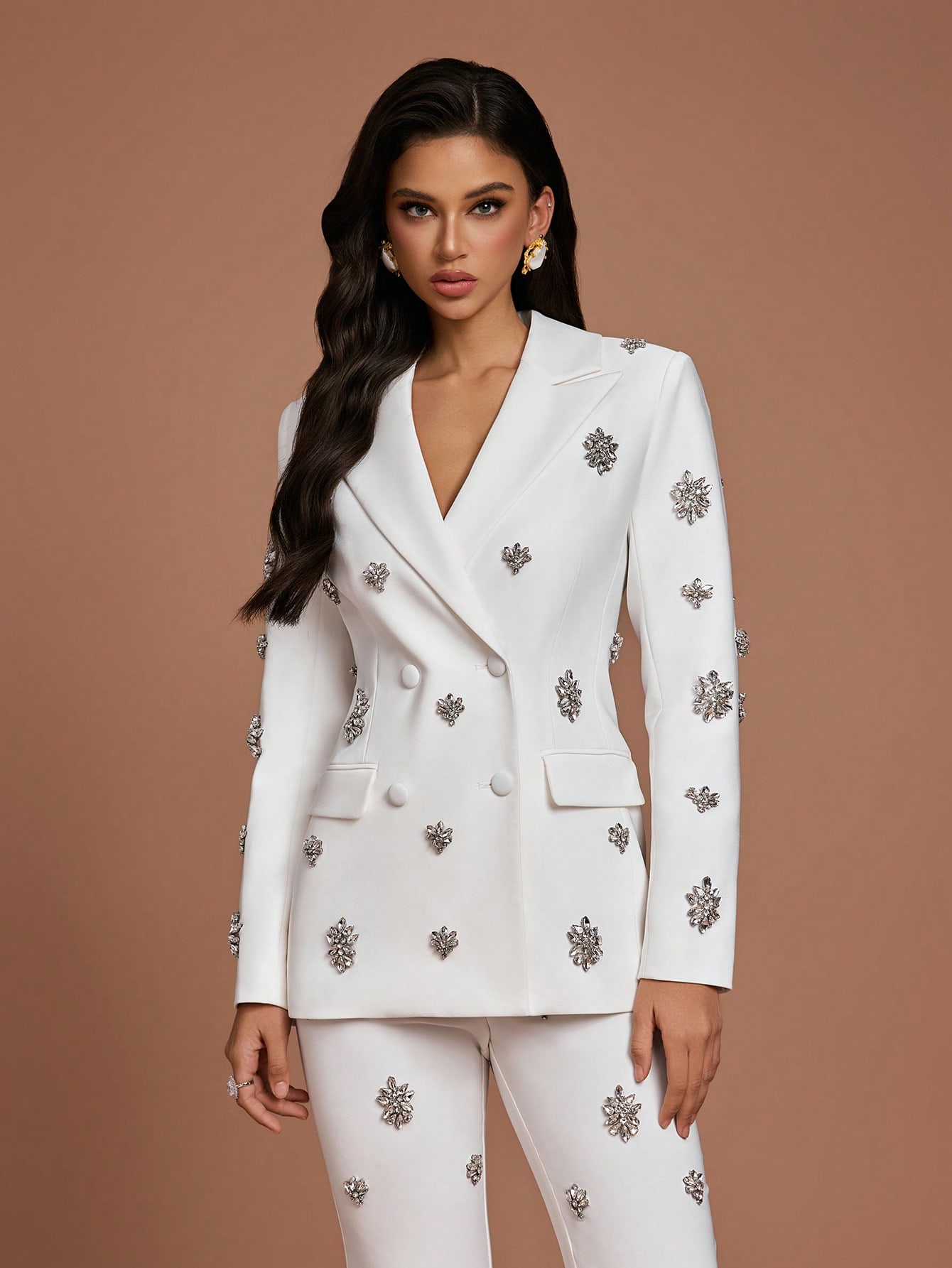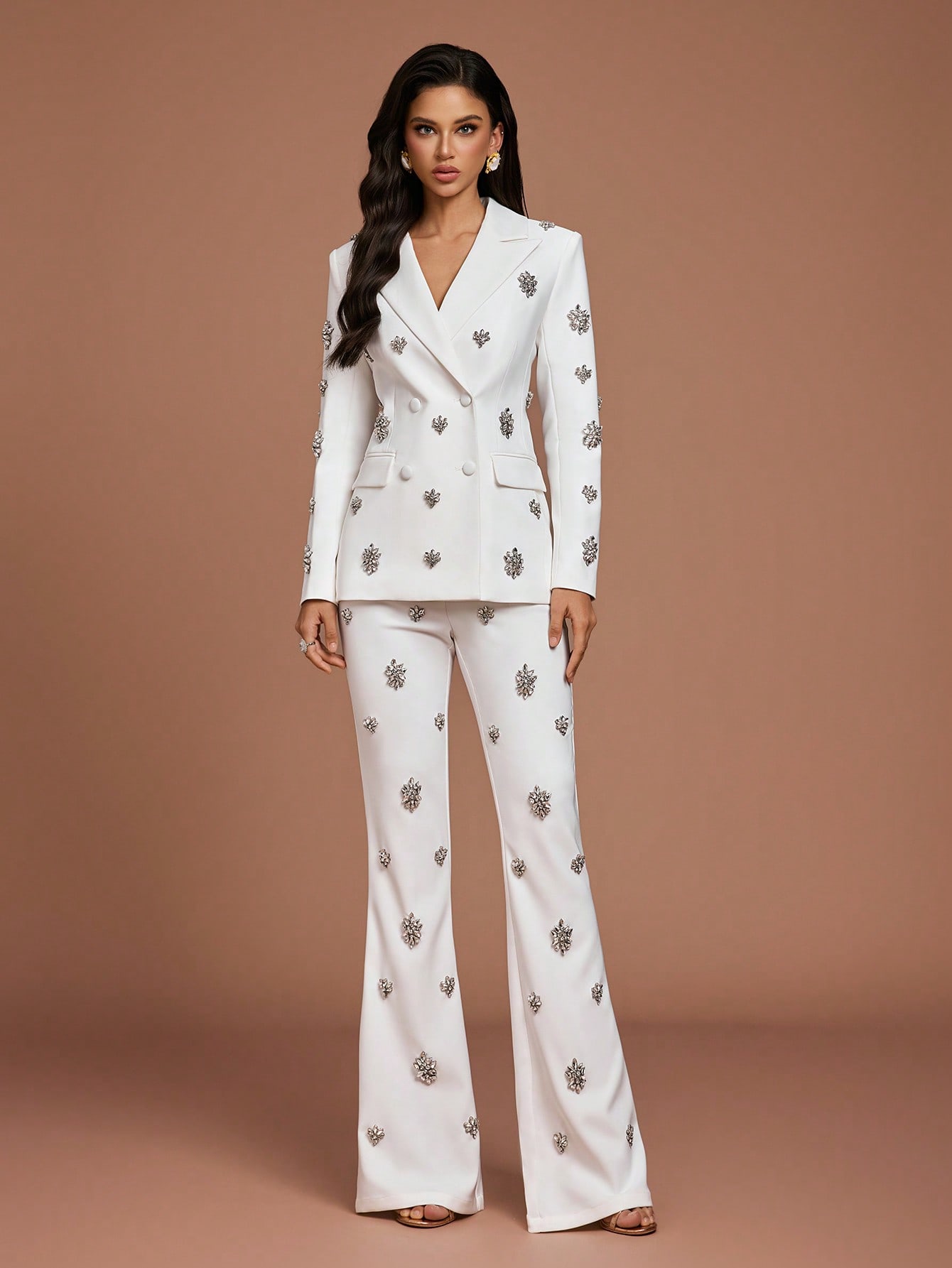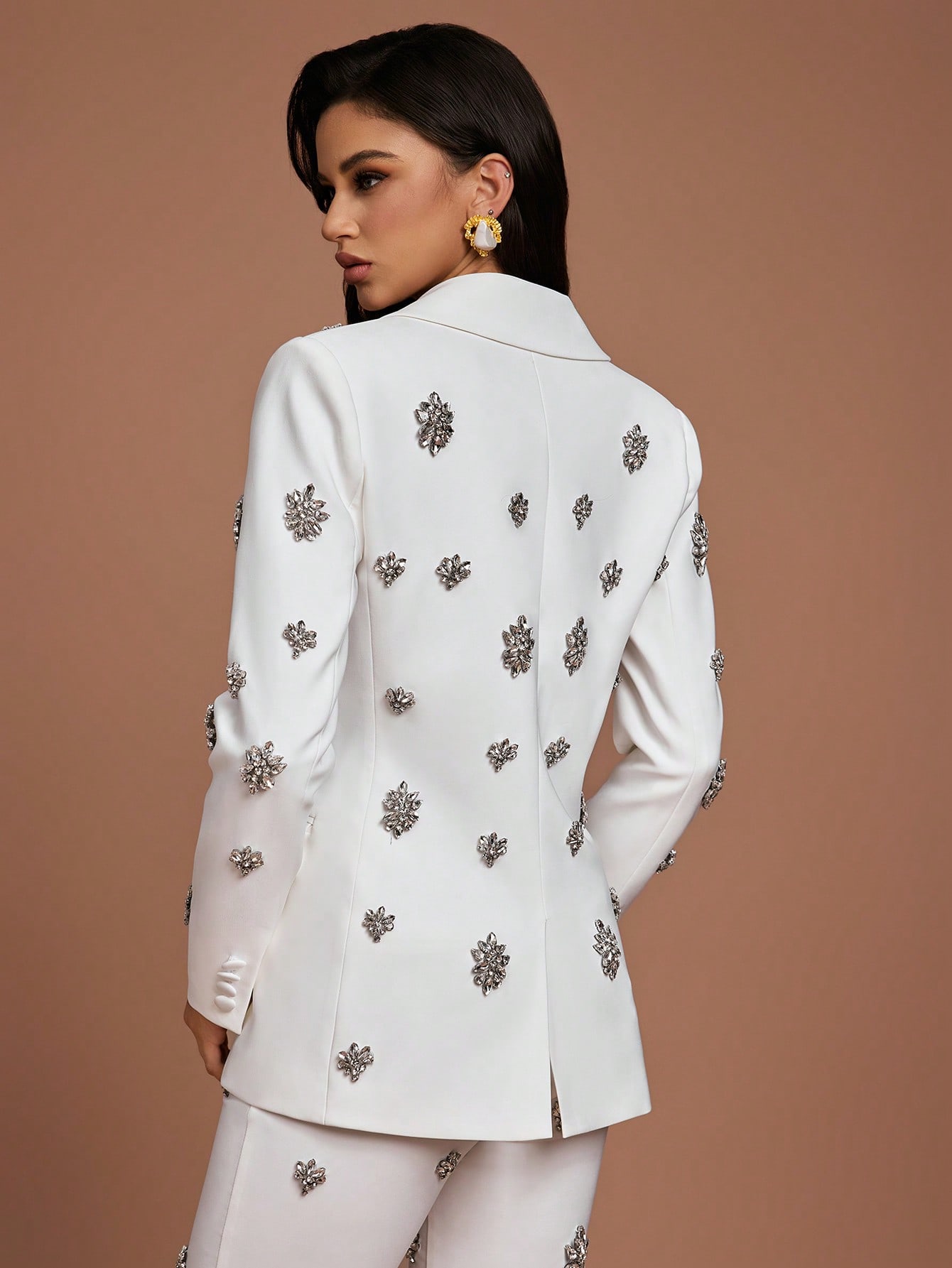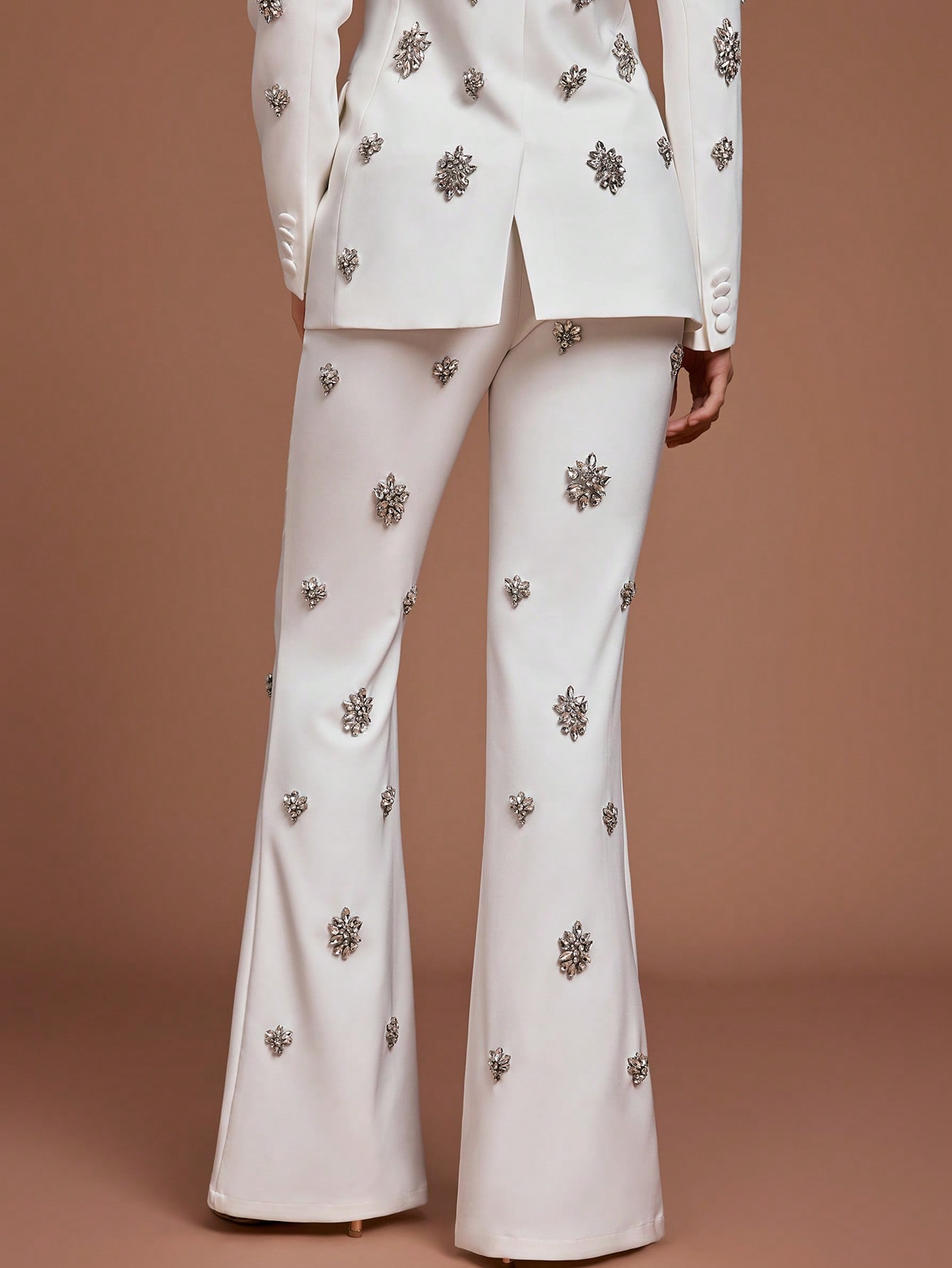 Women's Elegant White Two Piece Suit Set with Crystal Embellishments Collar Regular Sleeve Button Details Non Stretch Fabric