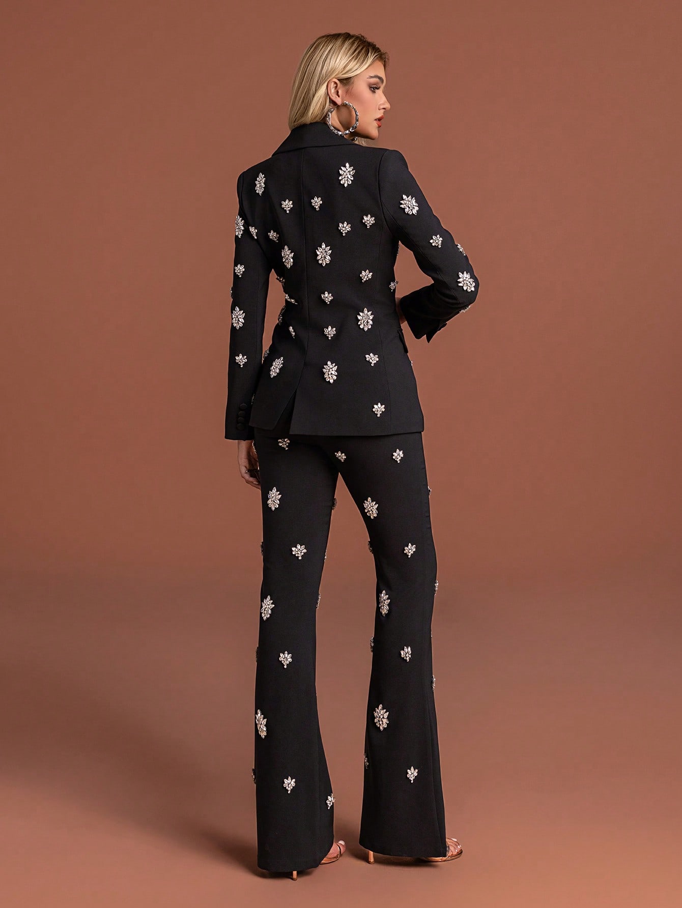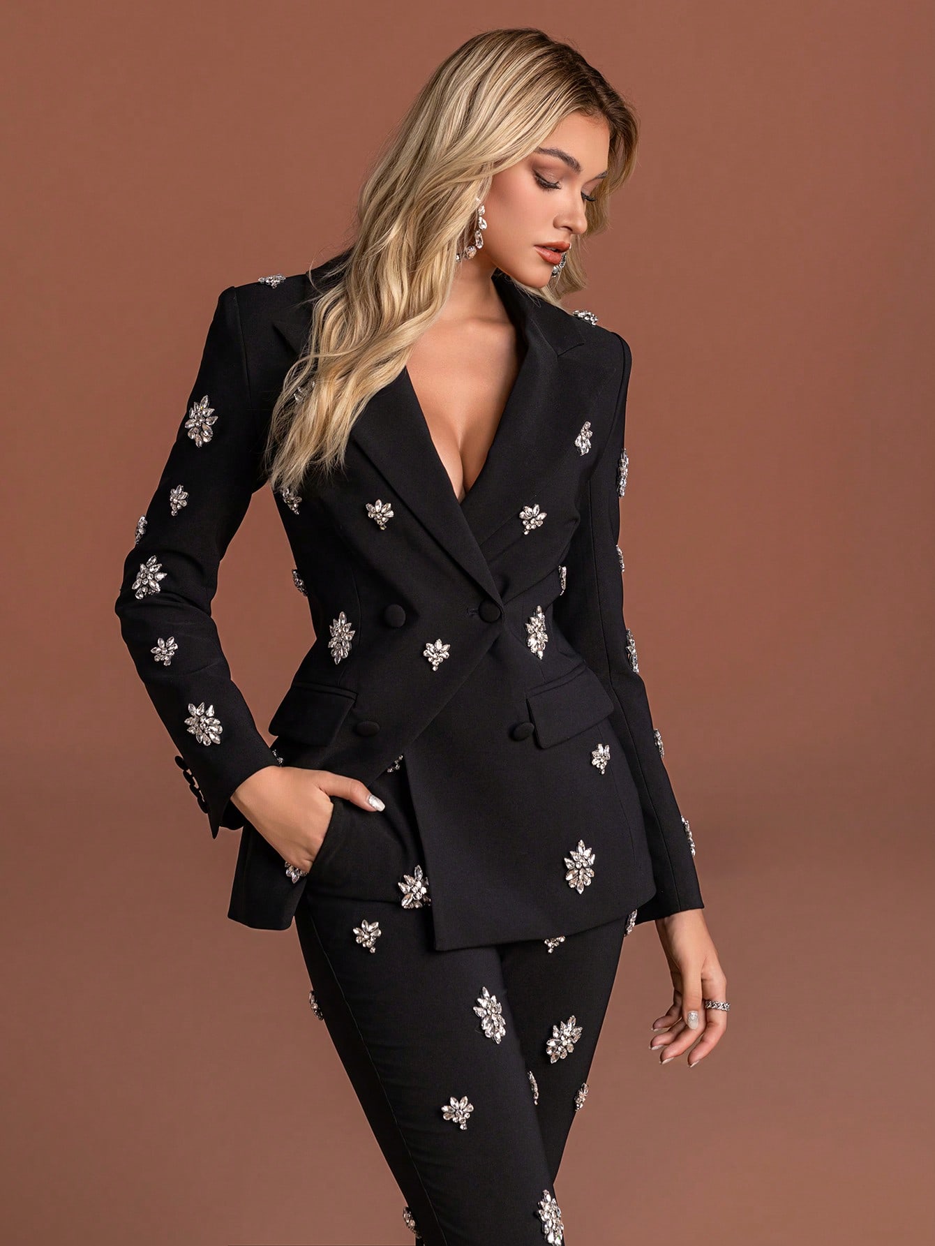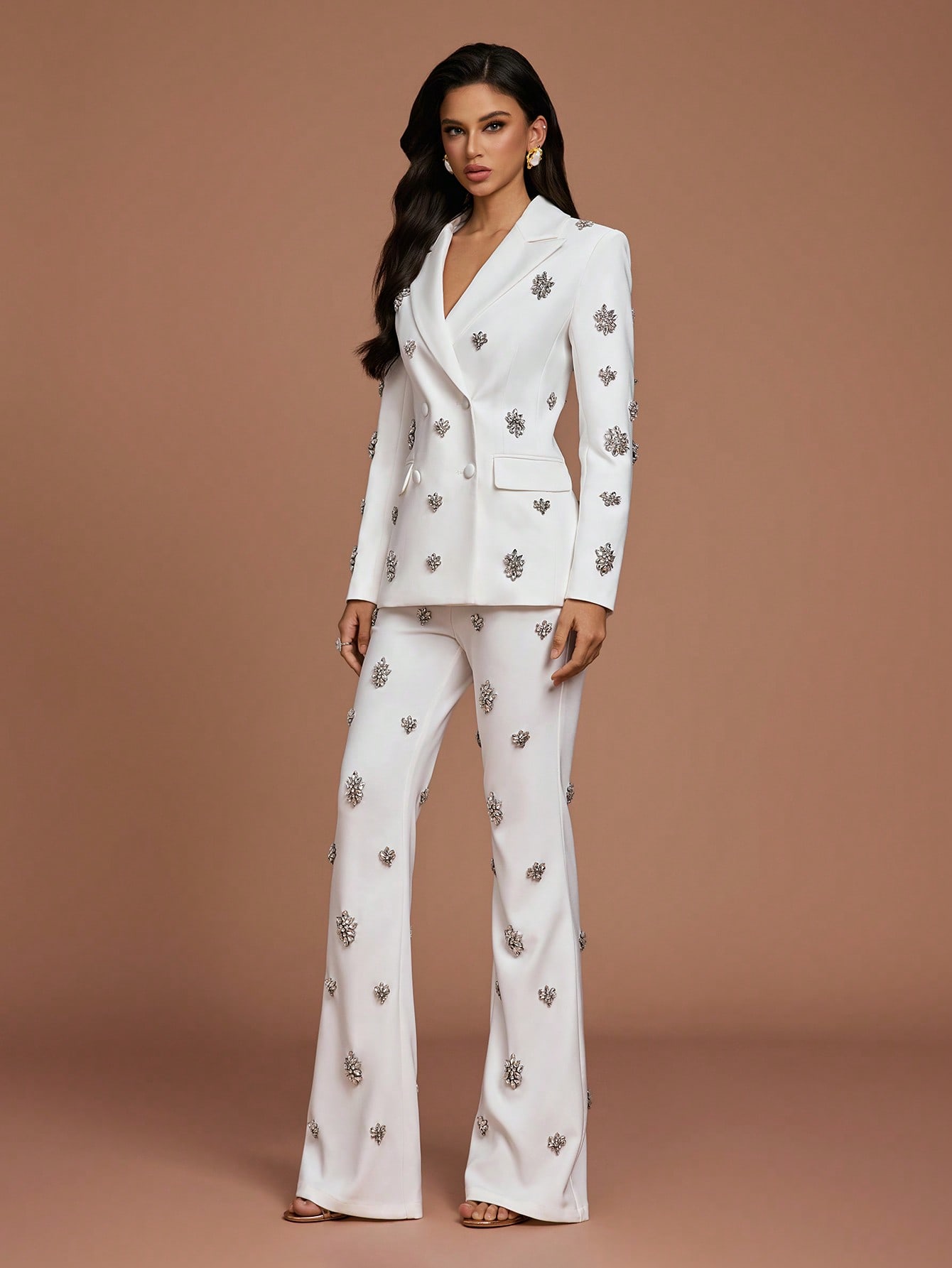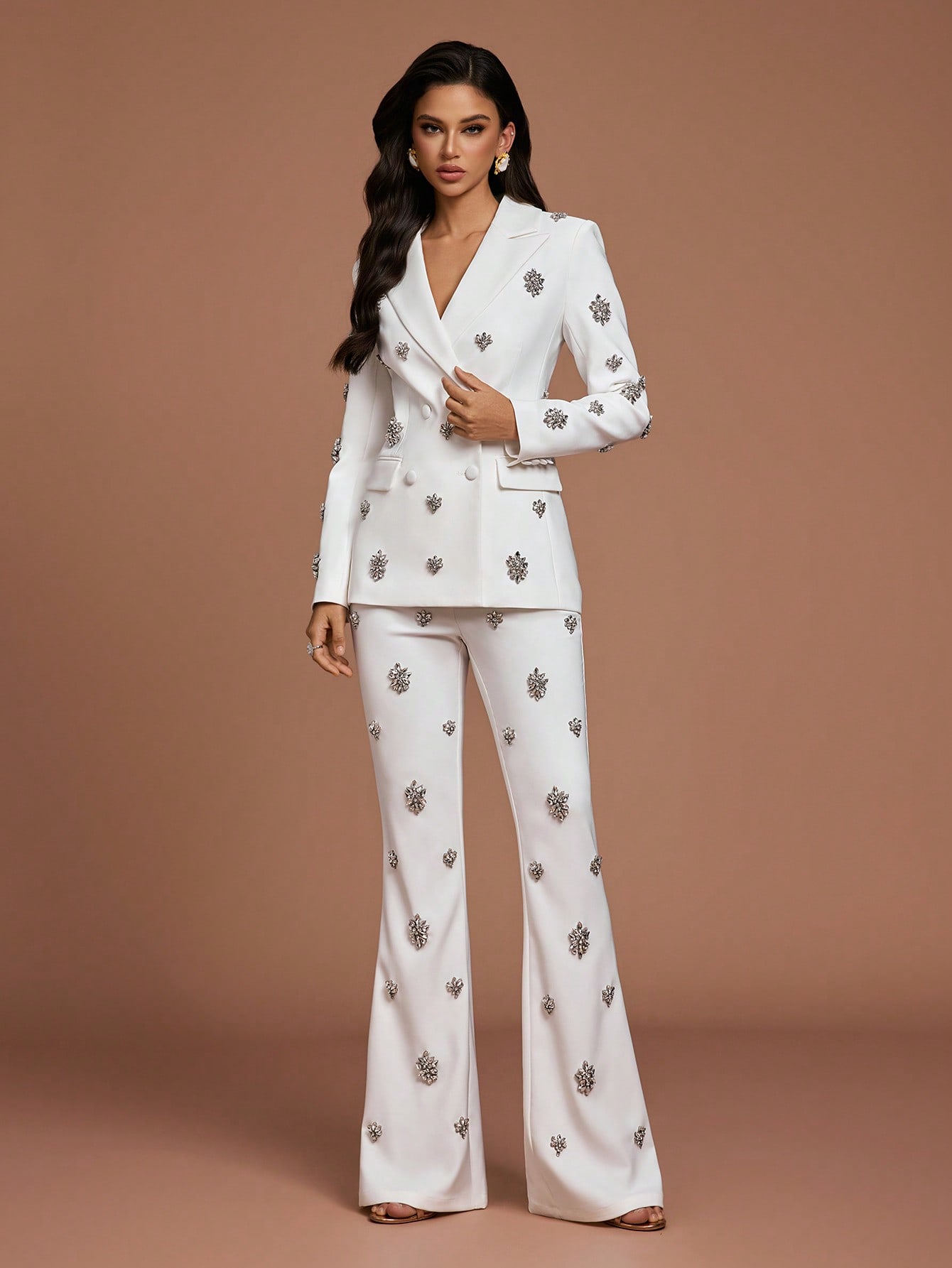 Women's Elegant White Two Piece Suit Set with Crystal Embellishments Collar Regular Sleeve Button Details Non Stretch Fabric