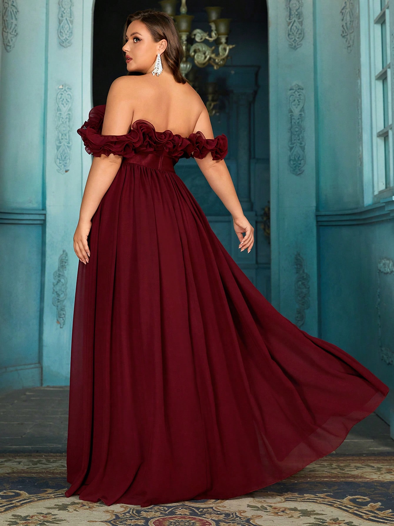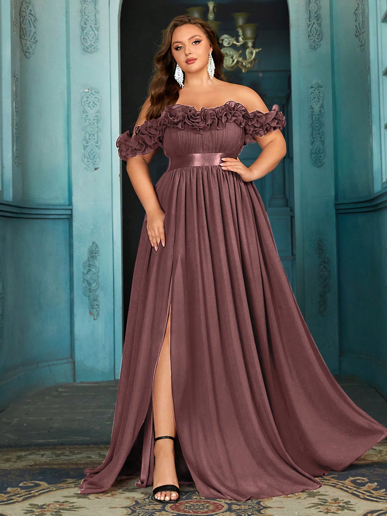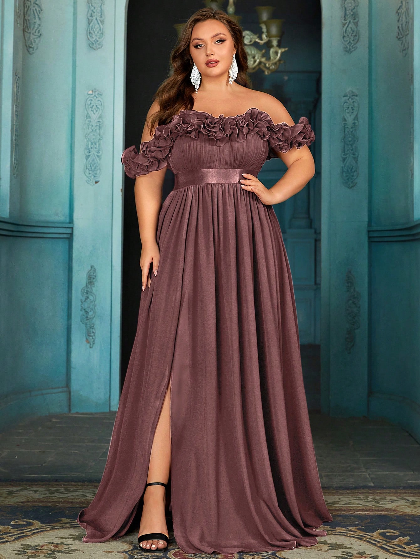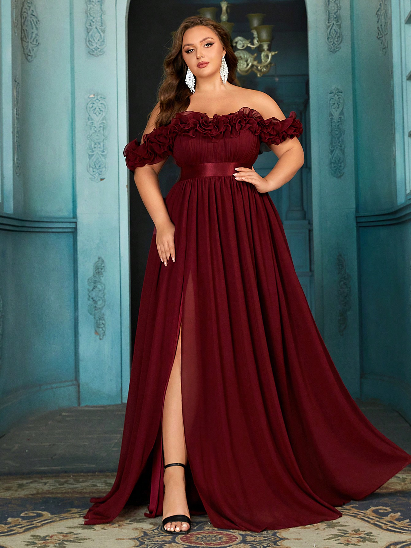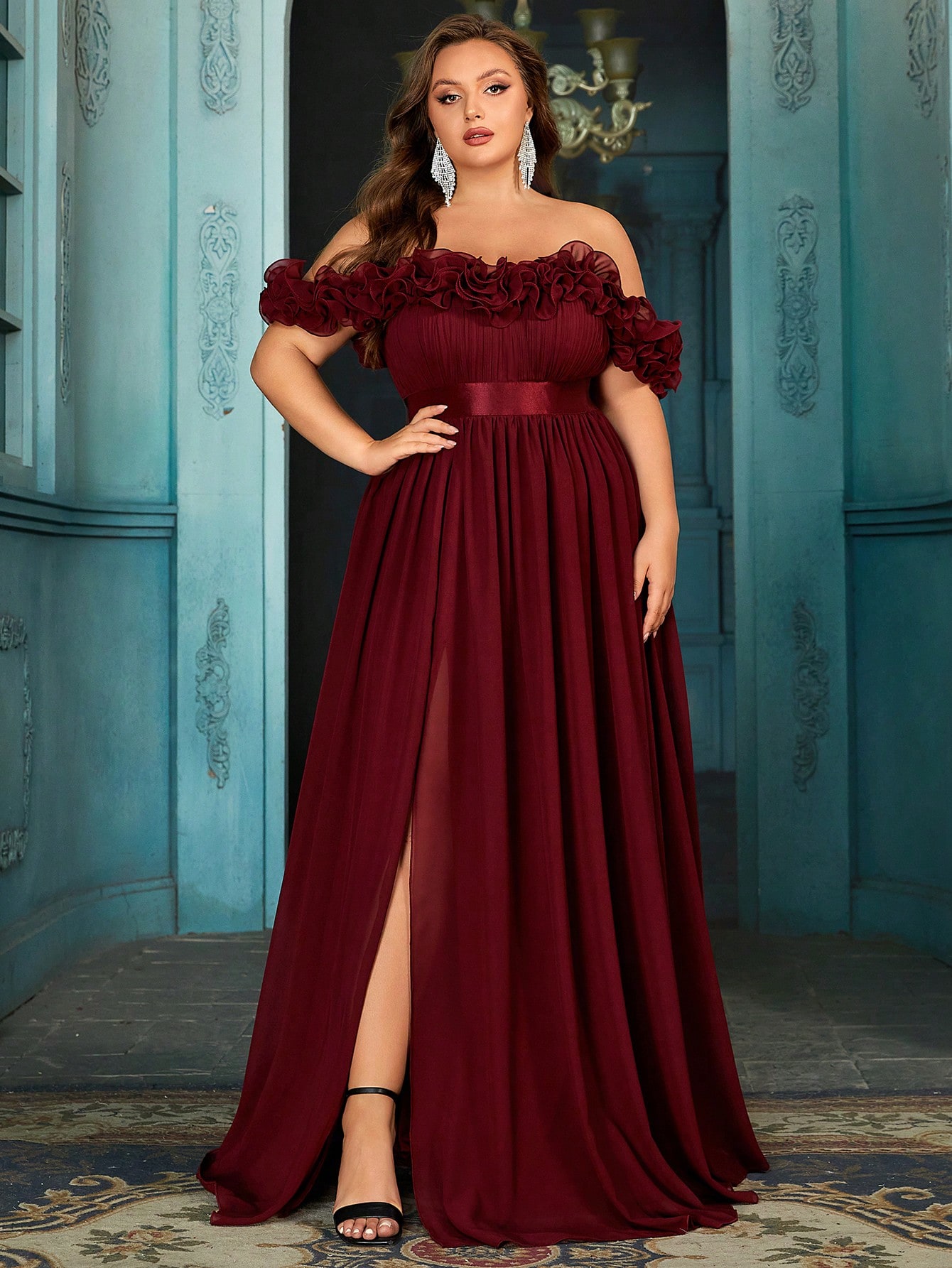 Women's plus-size elegant chiffon lace off-shoulder formal prom maxi dress,exposed shoulders ruffled evening gown, fitted waist, slit hem cocktail dress, wine red wedding guest dress, bridesmaid dress, Christmas festival dress, birthday dress