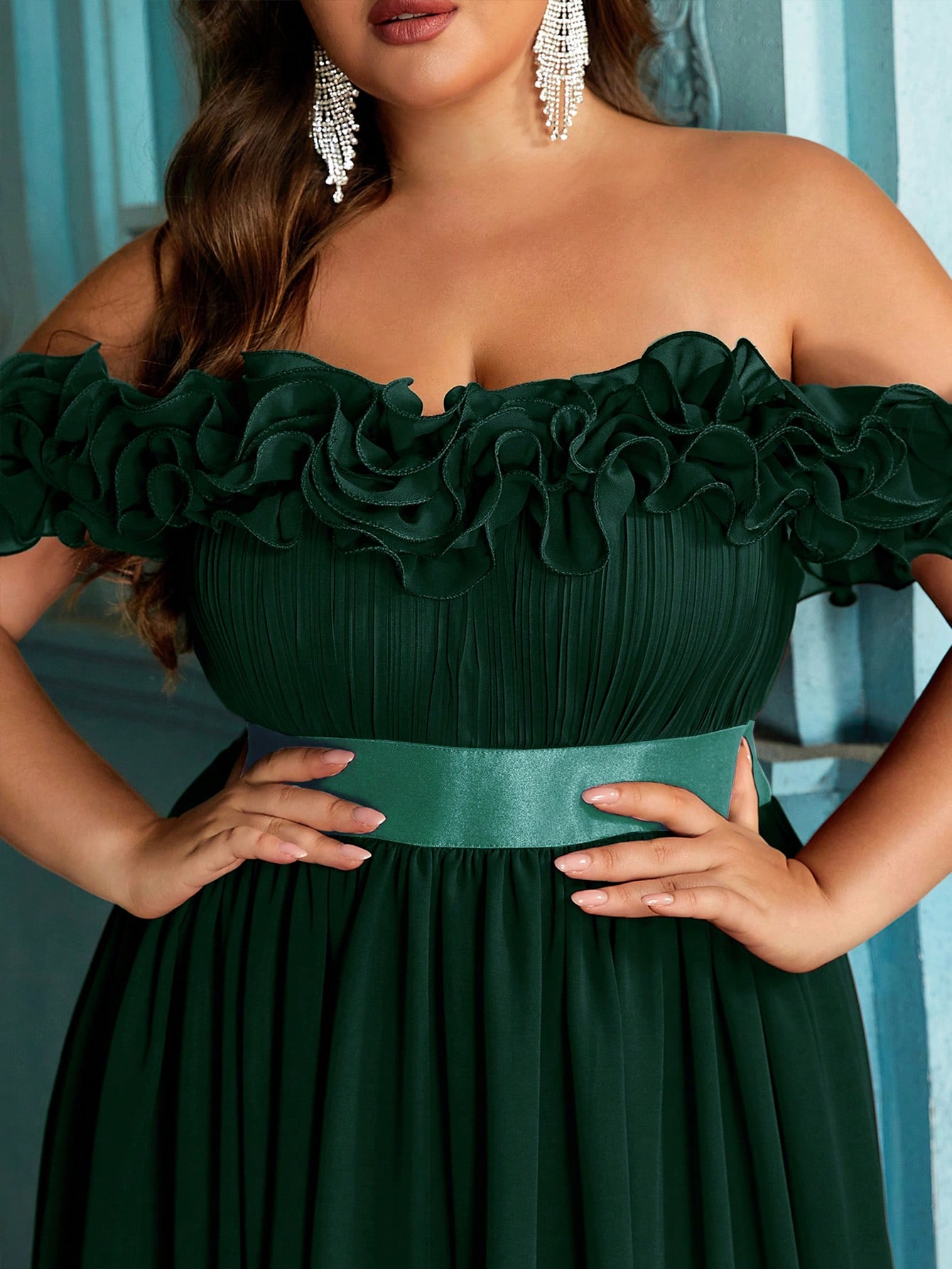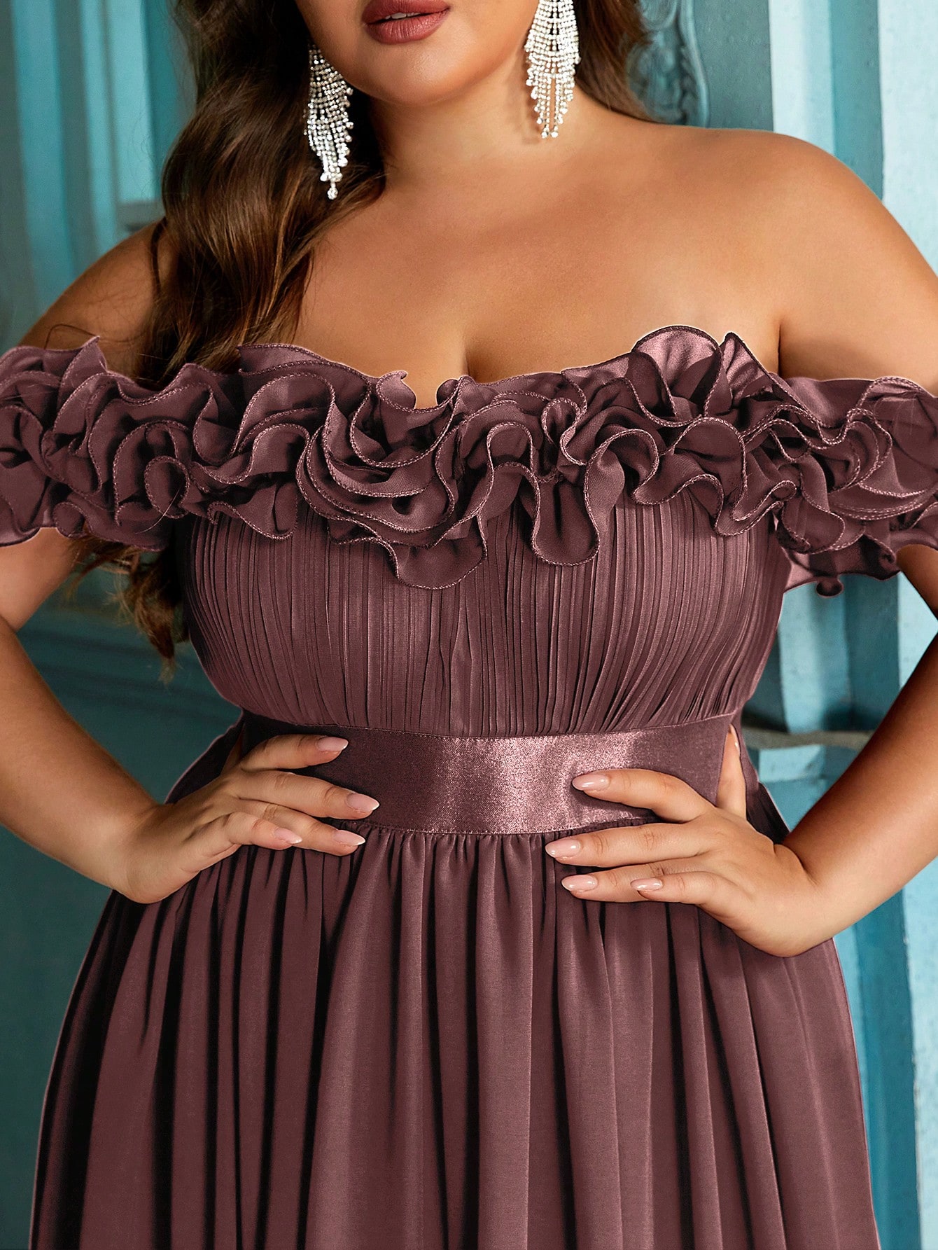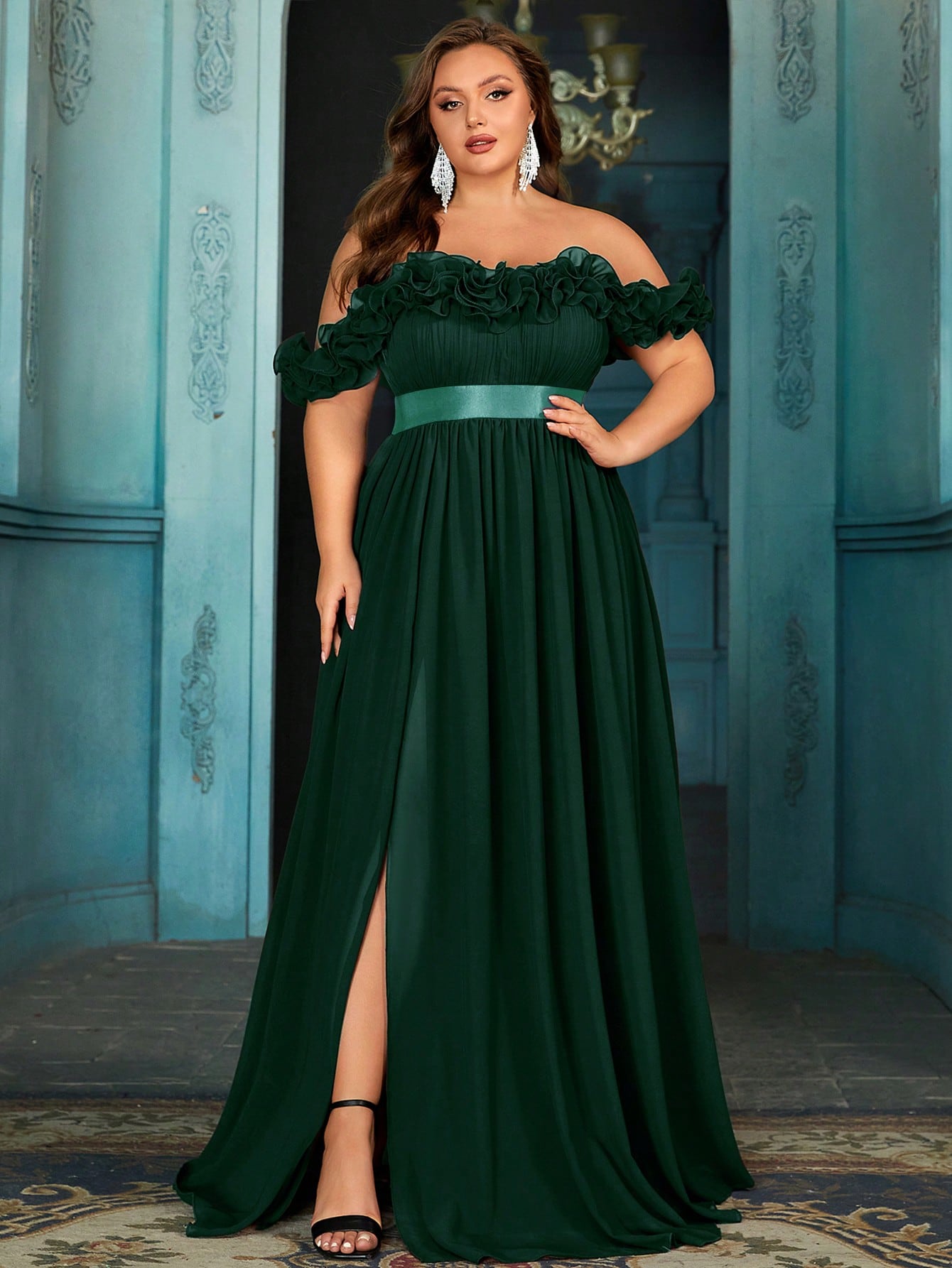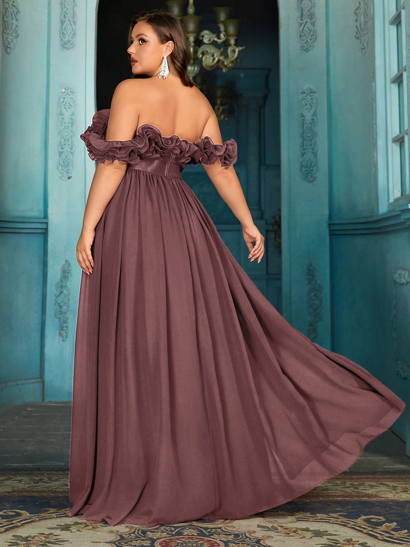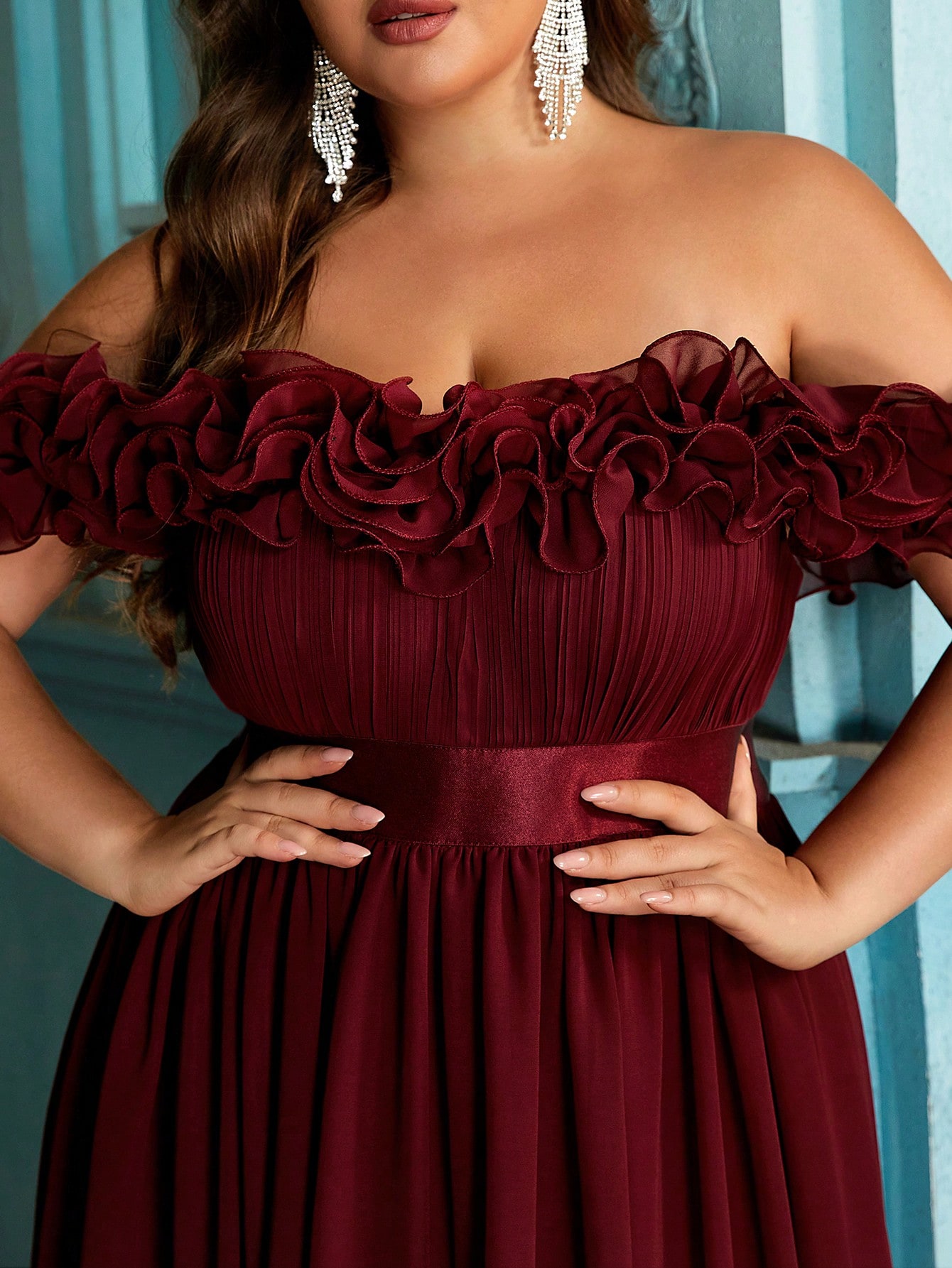 Women's plus-size elegant chiffon lace off-shoulder formal prom maxi dress,exposed shoulders ruffled evening gown, fitted waist, slit hem cocktail dress, wine red wedding guest dress, bridesmaid dress, Christmas festival dress, birthday dress