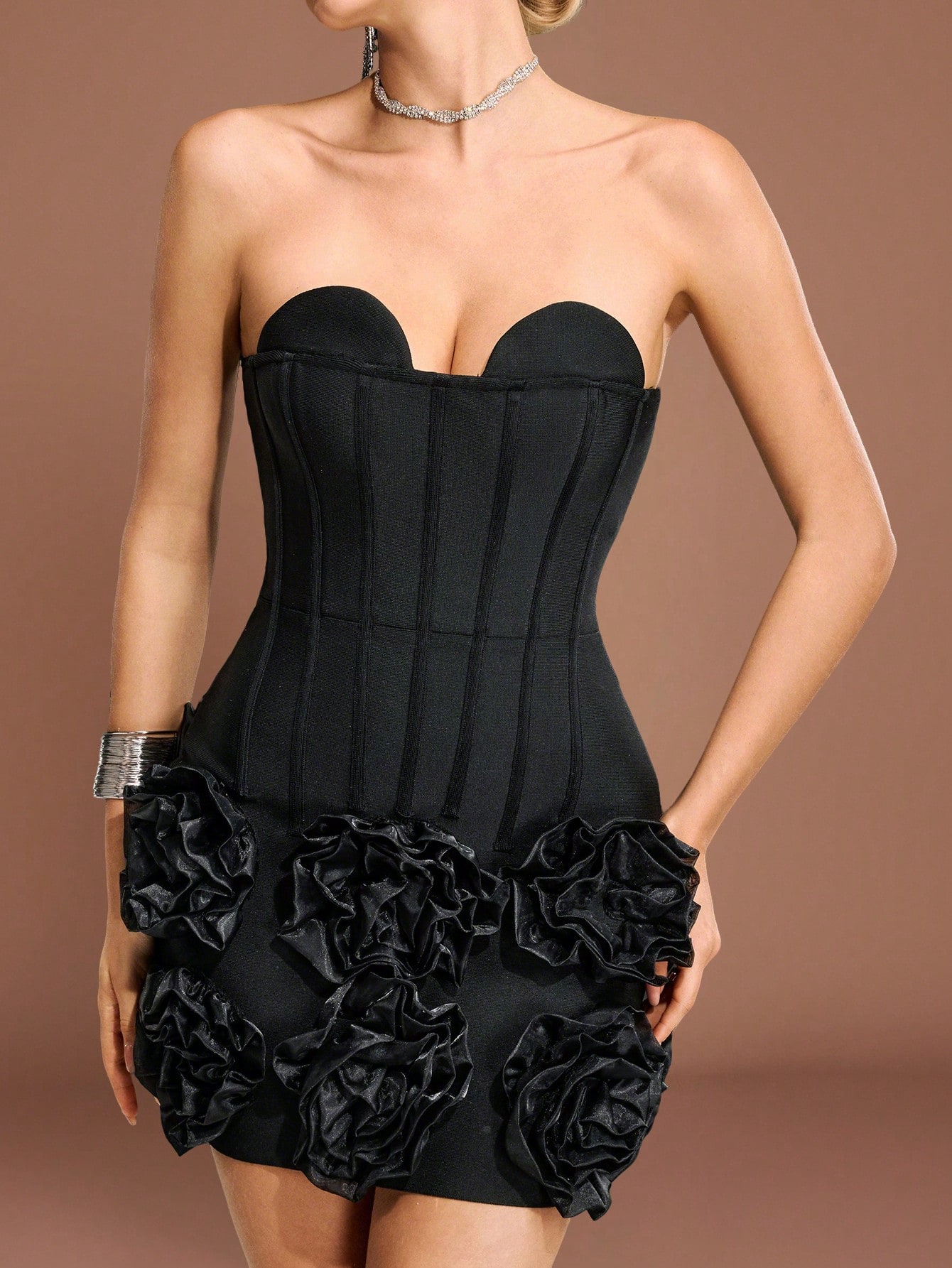 Women's Ruffle Rose Knot Bandage Mini Dress, Strapless, 3D Floral Decor, Bodycon Cocktail Dress, Elegant For Holiday Party, Wedding, Birthday, Formal Occasion, Wedding Guest Attire, Prom